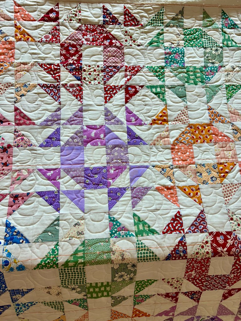 But I’m sewing on the binding now. But I’m really happy with how this quilt came out. The panto longarm quilter Wendie Currie suggested is just providing awesome texture–the muslin back is so, so pretty.