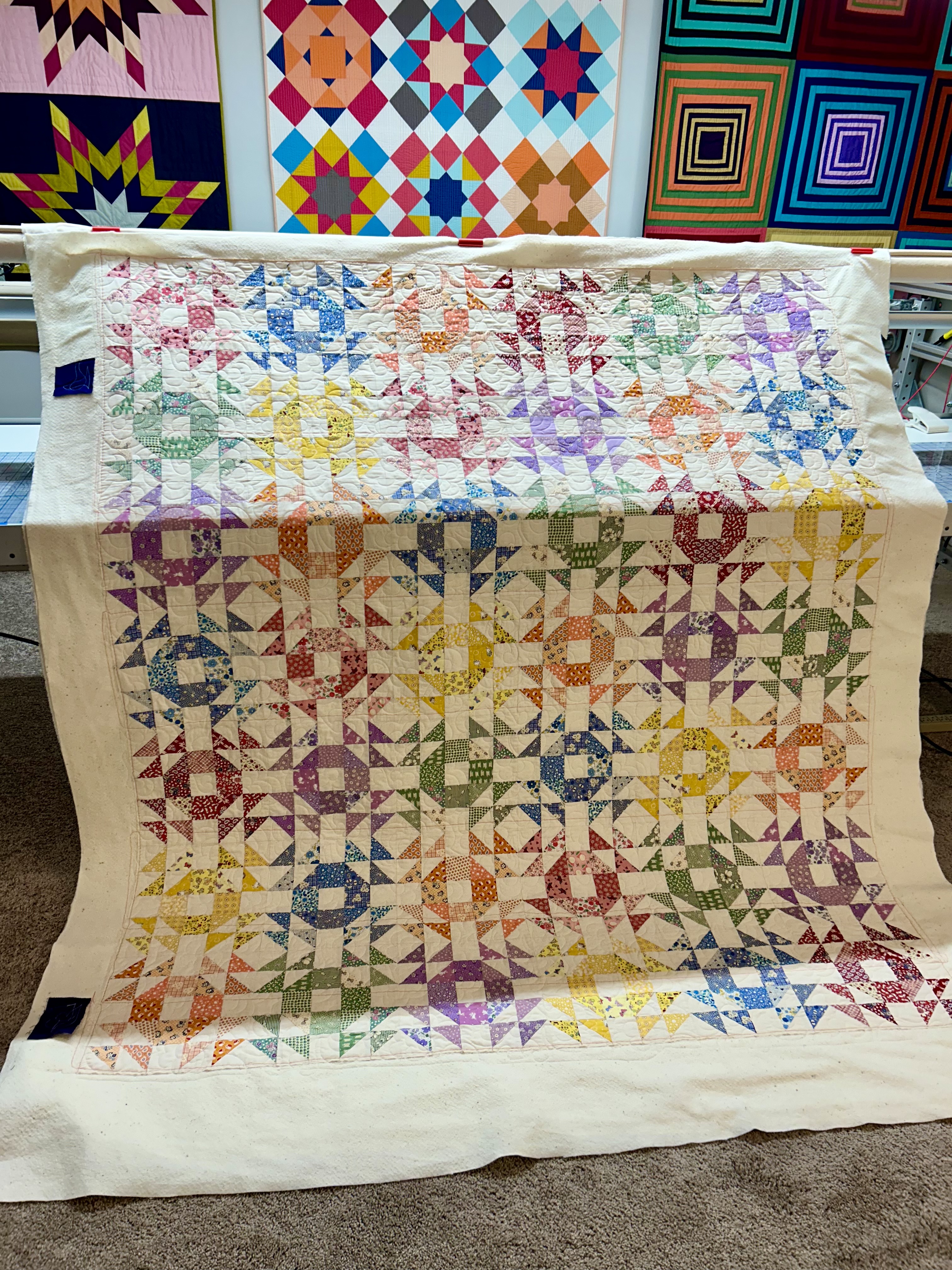 But I’m sewing on the binding now. But I’m really happy with how this quilt came out. The panto longarm quilter Wendie Currie suggested is just providing awesome texture–the muslin back is so, so pretty.