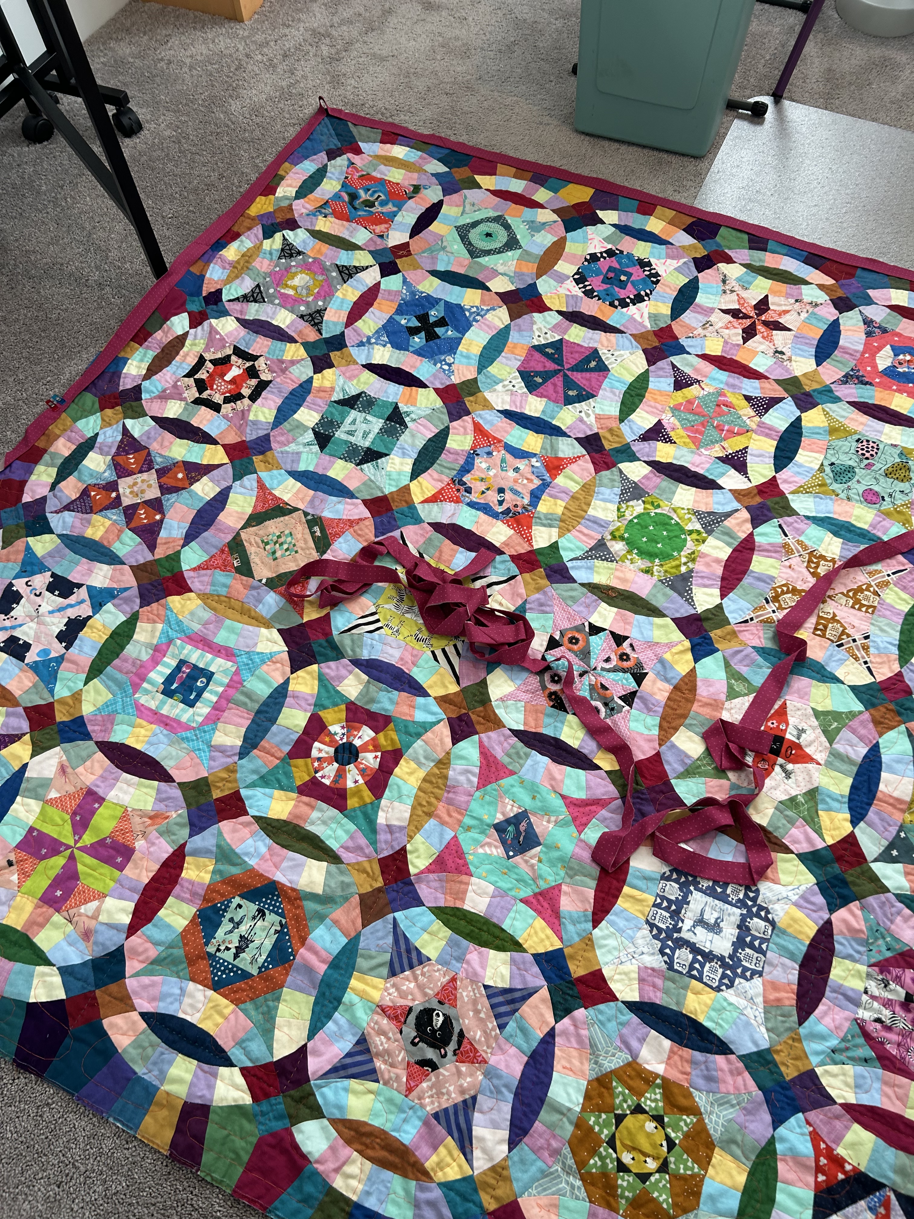 Betsy sent a pic of this quilt she just finished for a friend only the other night. This quilt looks easy, but it isn’t as there are block orientation issues. What followed when she sent this picture was a discussion of what binding to use. (Her longarm quilter does awesome work, doesn’t she?)
