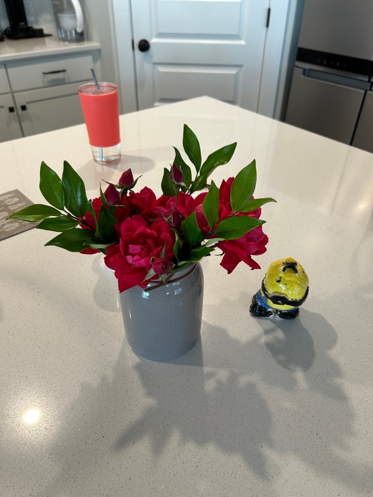 Roses on the kitchen counter…alongside a “minion” piece made and gifted by a granddaughter. AND, now that I look, a glass all filled with filtered water and a straw.