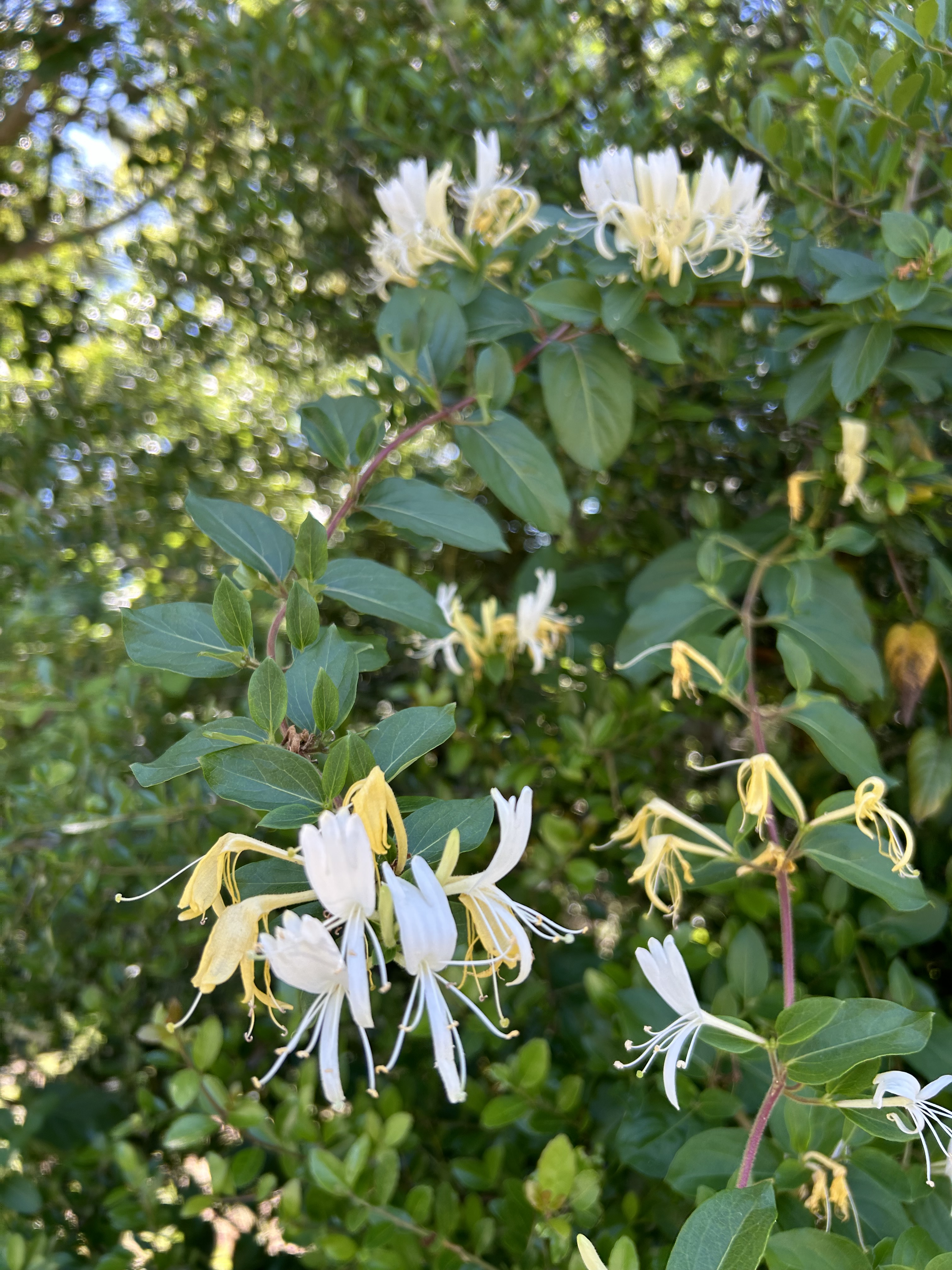 The honeysuckle is blooming in the woods now. On my Tuesday walk, I stopped to smell this honeysuckle plant. It was heavenly–and qualifies as savoring one of the quiet moments in one’s day.