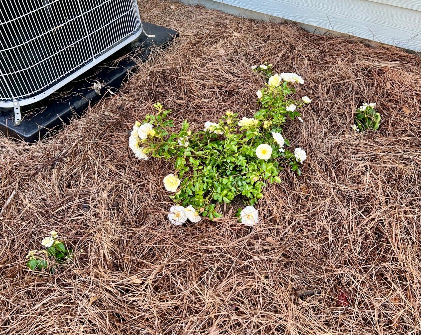 I went back to Hidden Pond Nursery also on Tuesday, to look for a plant for this vacant spot in the garden. I came home with this rose–a floribunda called “Popcorn”–and three perennial Lantana that are the same color. All these plants will spread out–but not get higher than 2 feet.