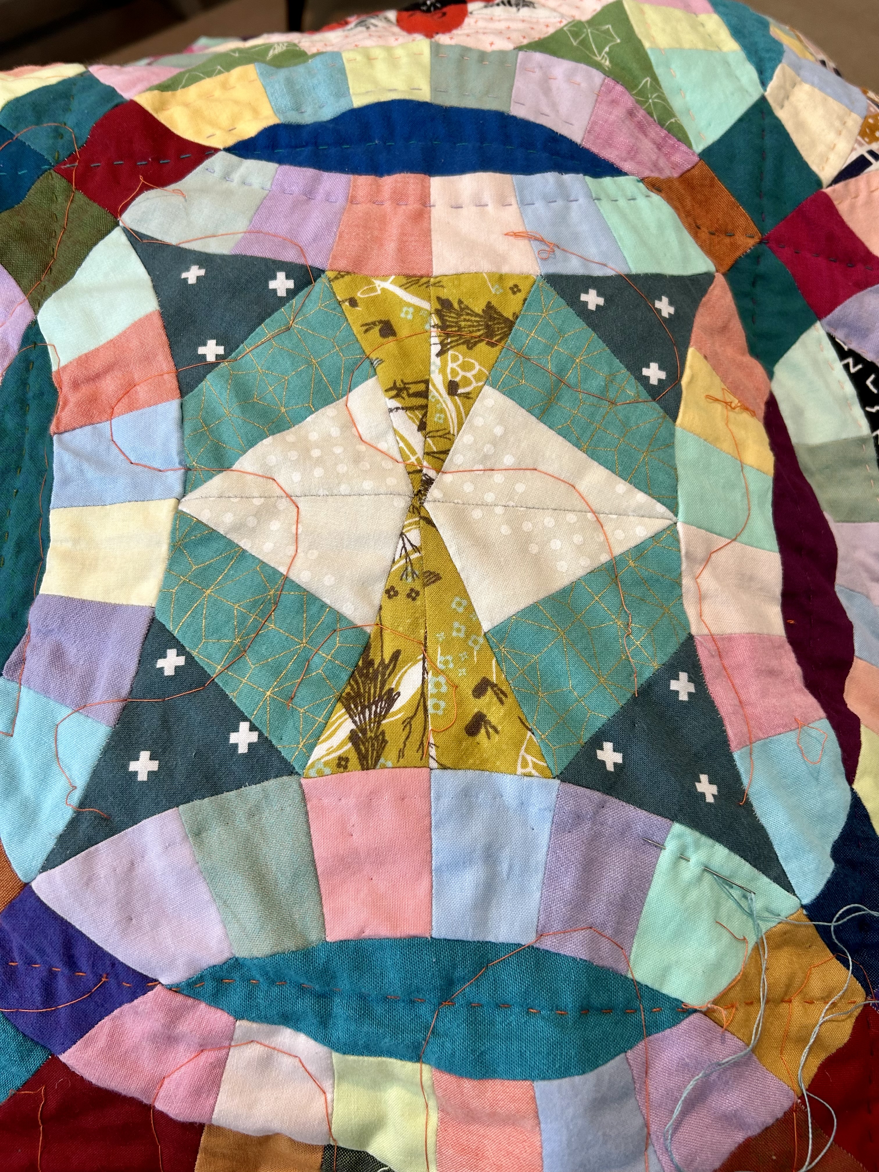 I am just finishing hand sewing the LAST block in the 4th row of 6 rows in “Happy,” the quilt that has taken YEARS to make. That means the middle is done and I’m over the hump of finishing this quilt as the edge rows are so much easier to get to while hand quilting. The border will quilt fast as there are not pesky, bulky seams to manage.