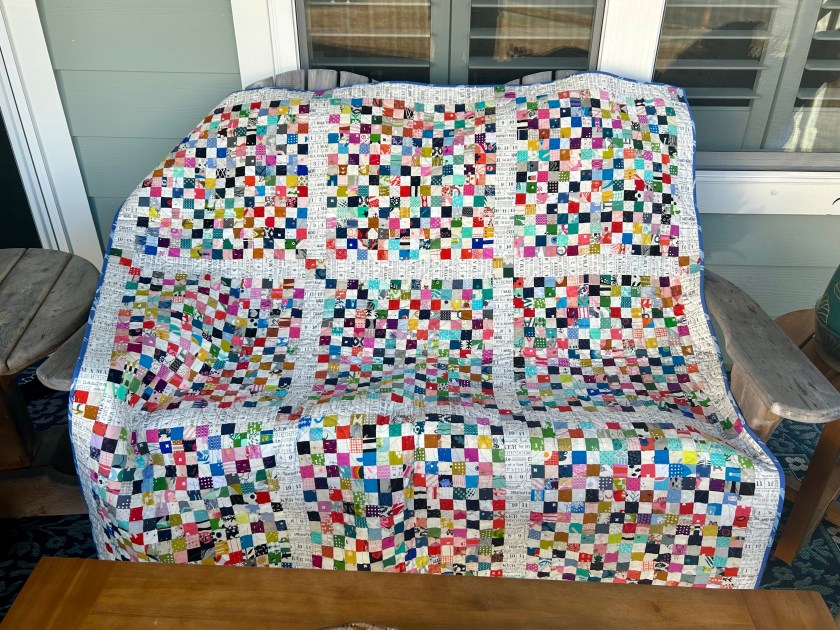 Remember the cute backing? The gender of this baby was a closely held secret, but I thought while making it that “Sprinkles” would be great for a girl or a boy baby. It is all Cotton+Steel/Ruby Star Society fabrics–except for the sashing pieces. And it dates back to the ongoing project of 5 or so years that started when I cut up all this hoarded fabrics and started making quilts–which went out in droves to family members over the years. “Sprinkles” is the last one.