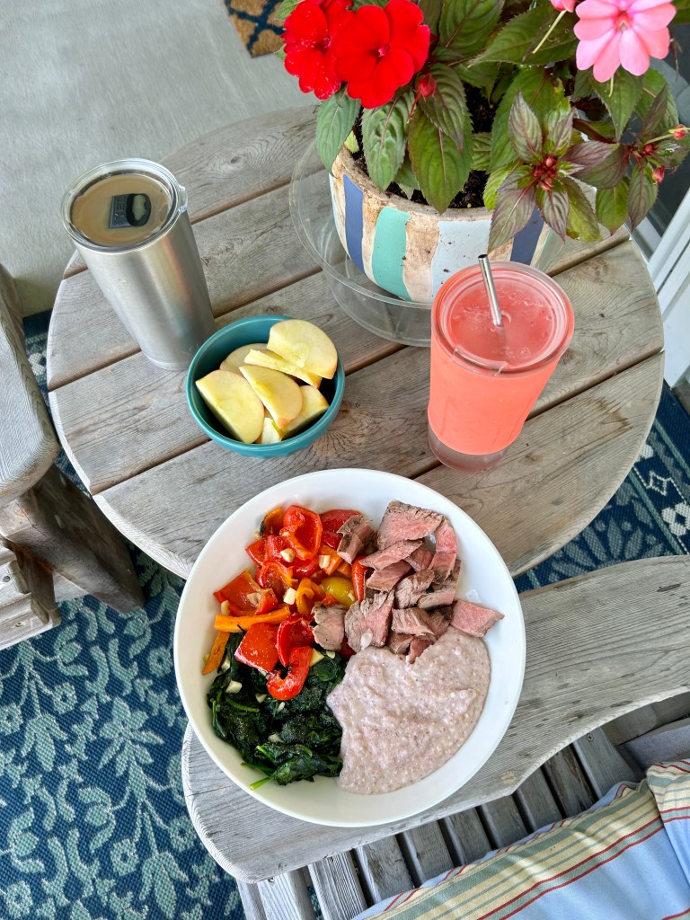 Here, leftover grilled flank steak, roasted sweet peppers/carrots, spinach and garlic sautéed in butter, and the “pink” grits: