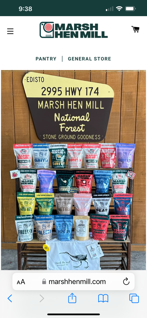I cooked “pink” grits the other day–from the Marsh Hen Mill brand of grits, a farm on Edisto Island. The pinkness comes from the type of corn used. They cooked faster than the Anson Mills rough cut grits, but they were also much milder. And, not organic. (Organic corn is a hard act to raise, actually.) Marsh Hen Mill has several types of grits and also raises the Carolina Gold rice so special to this Low Country area.