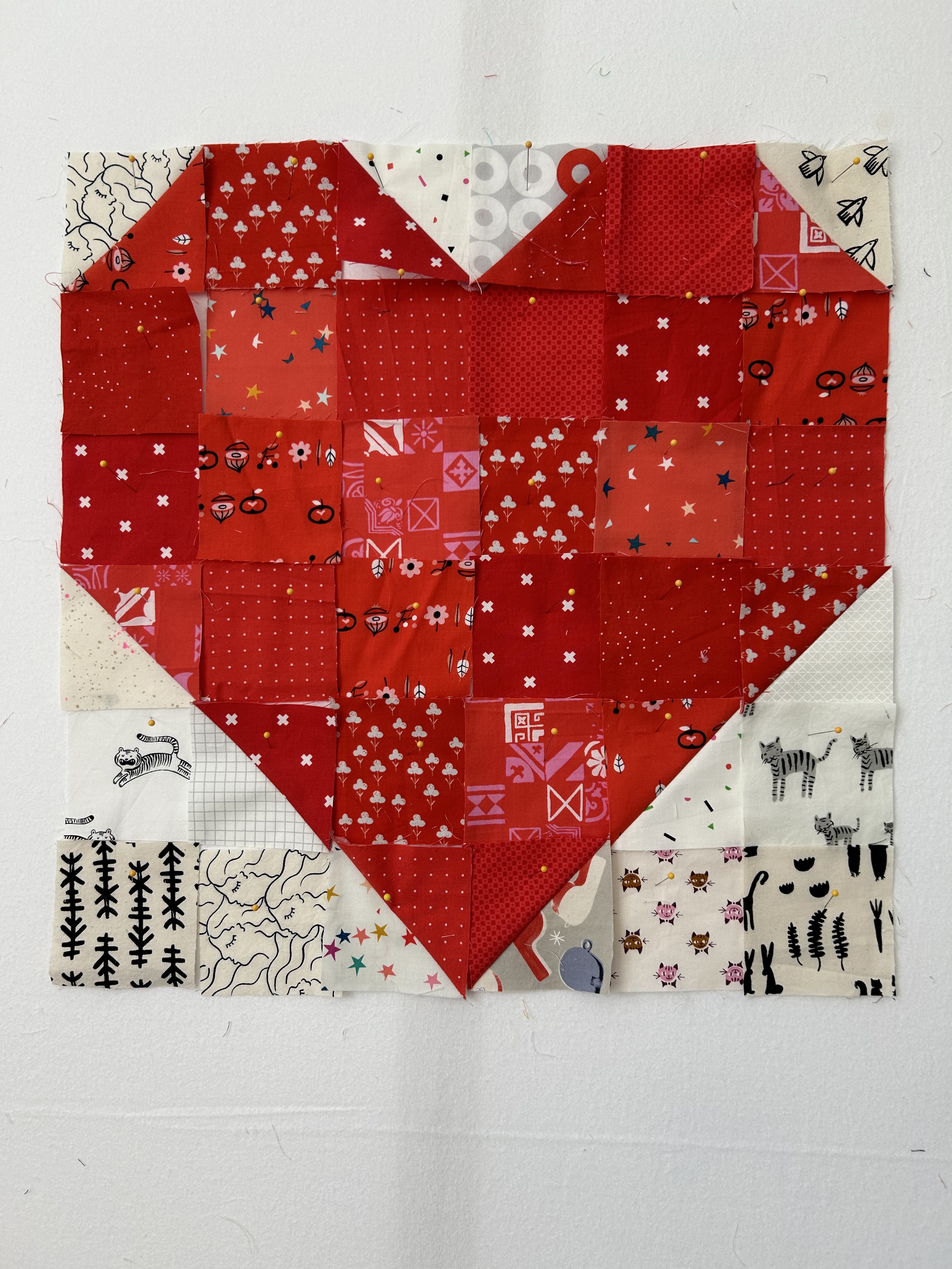 I’ve started a lap quilt using as many of the 3 1/2-inch squares as I can from the bins holding the cut-up Cotton+Steel/Ruby Star Society squares. There is ONE red heart and the rest of the quilt is low-volume. Easy Peasy.