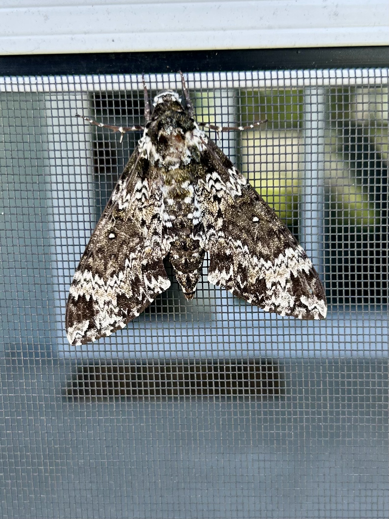 Holy Moly! Look at this HUGE moth that is now resting on my back screen door! She’s 3 1/2 inches or so if you count the wing length.
