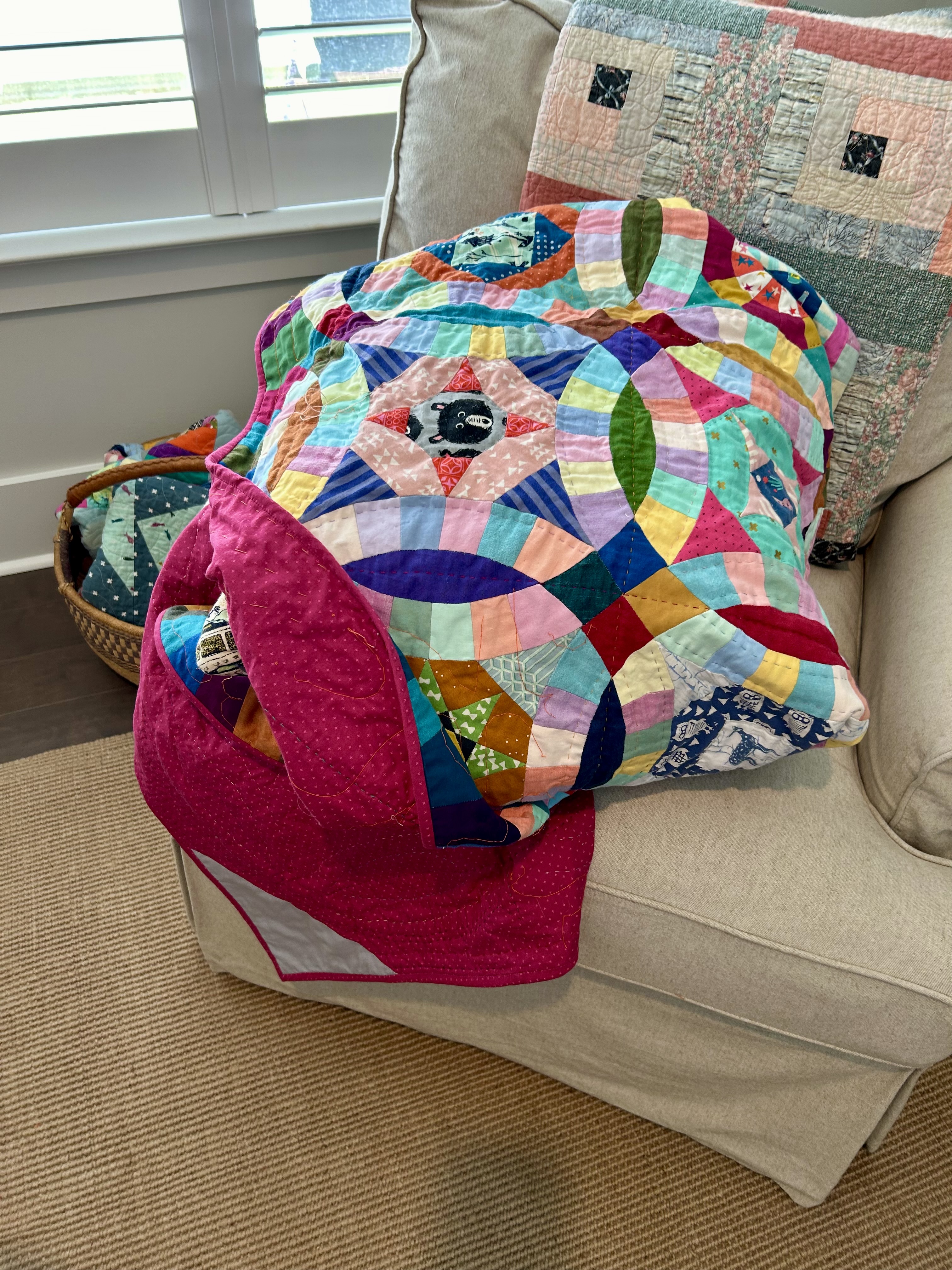 Here’s a sneak peak–I use a pillow to elevate hand work as it takes the stress off my arms and neck. The backing is AWESOME! It’s a Figo print. And it is PERFECT for this quilt.