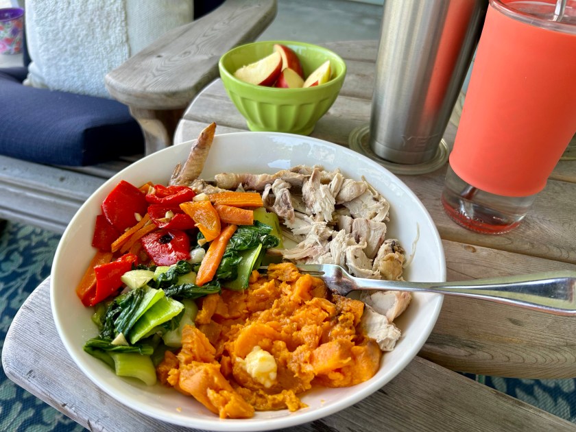 Noon dinners on the porch have been wonderful this past week. Here, roasted chicken; roasted sweet peppers, carrots, and garlic; baked sweet potato; sautéed baby bok choy; sliced Honey Crisp apple; and an espresso.