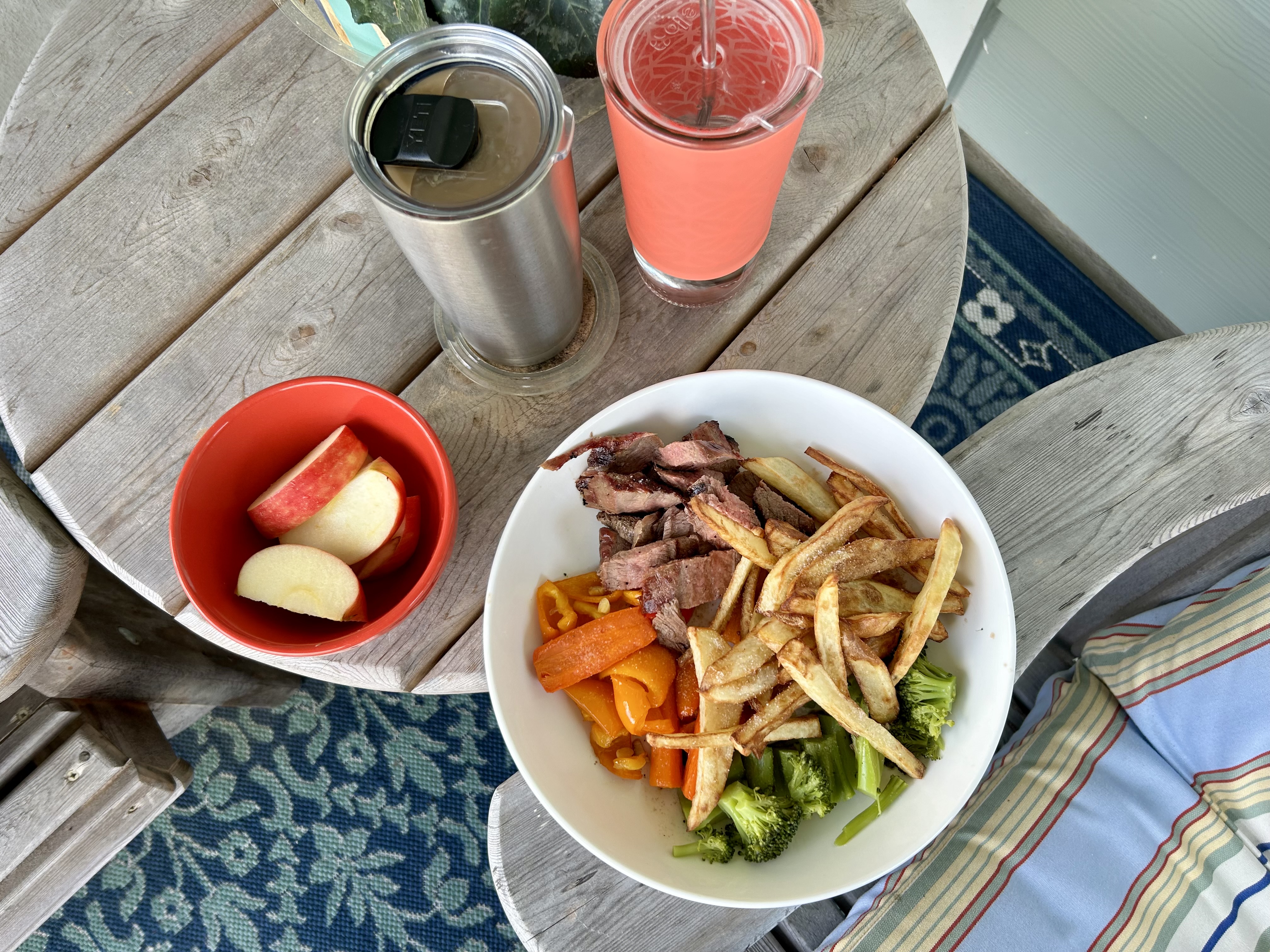 And some days later, grilled flank steak, roasted sweet peppers and steamed carrot (assets), steamed broccoli, air fryer French fries, sliced Honey Crisp apple, and an espresso.