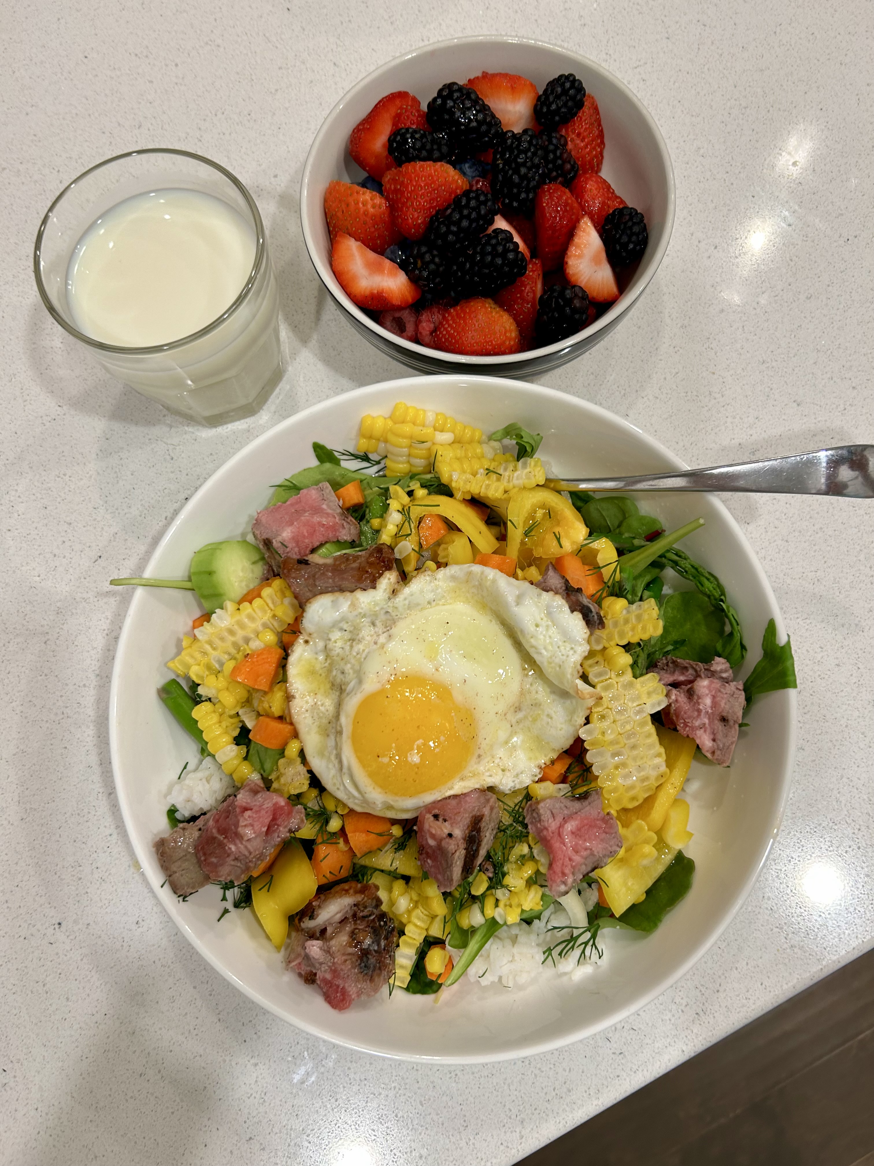 The other day I only had a bit of grilled steak in the refrigerator at supper time, so I fried an egg in a bit of butter to go on top of the salad. The corn is from some cobs I steamed. The base is a mixture of hearty baby greens. And I splurged on some fresh dill to put on my salads. The milk is, of course, raw milk, upon which I have thrived for over 20 years now.