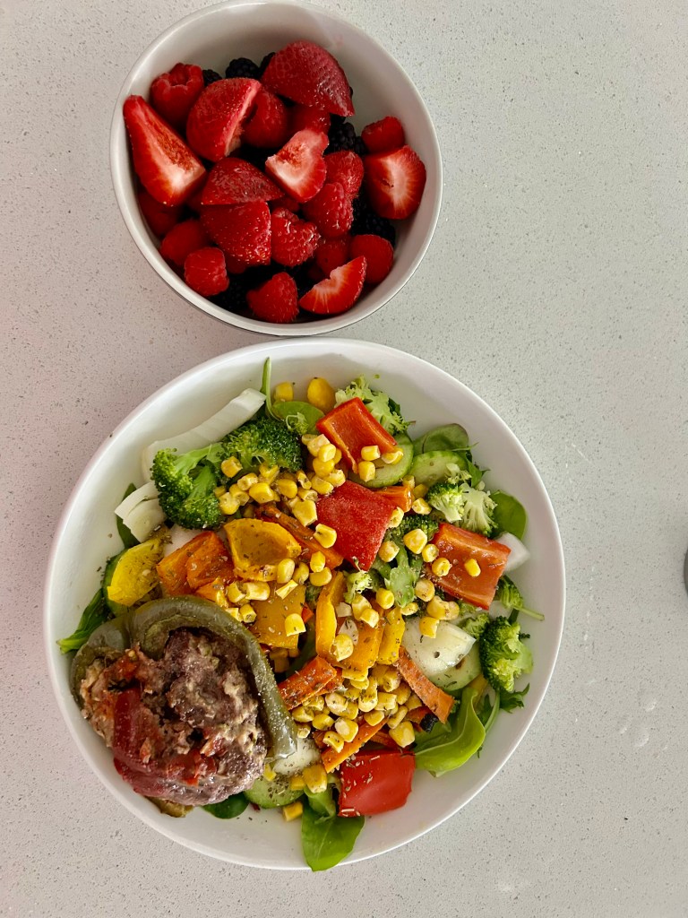 This supper salad’s protein is one of the stuffed green peppers I froze a few weeks back. I added some of the steamed broccoli I cooked at noon. The onion bits are from an organic Visalia.