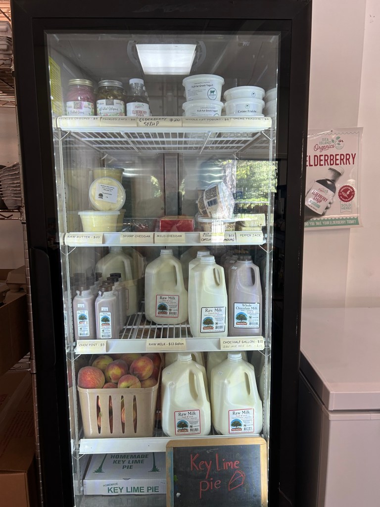 There is a refrigerator with raw milk and dairy products and fermented foods and items that need refrigeration.