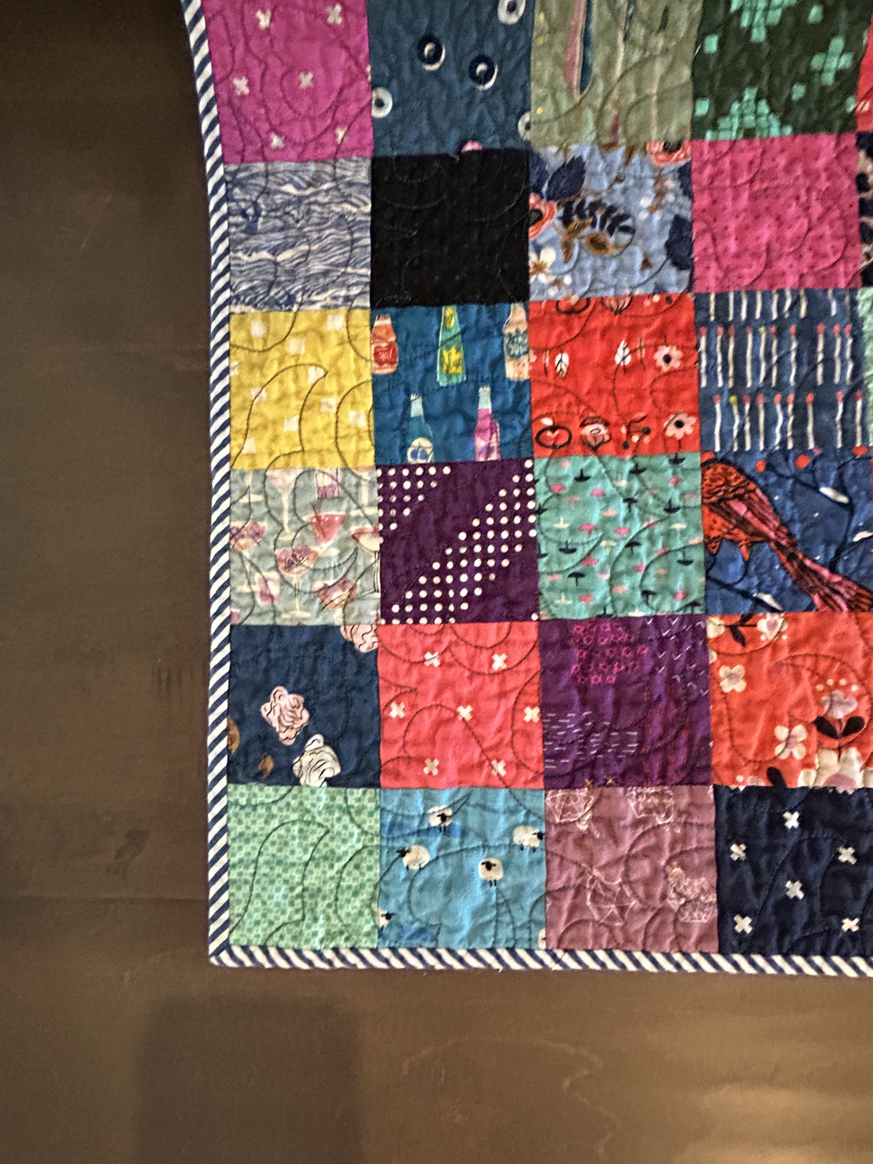 And I love how the striped binding came out on this quilt–which is meant to be like the red-white stripe binding on the neutral version. I also like how some of these Cotton+Steel/Ruby Society squares jump out at a viewer with such cute prints.