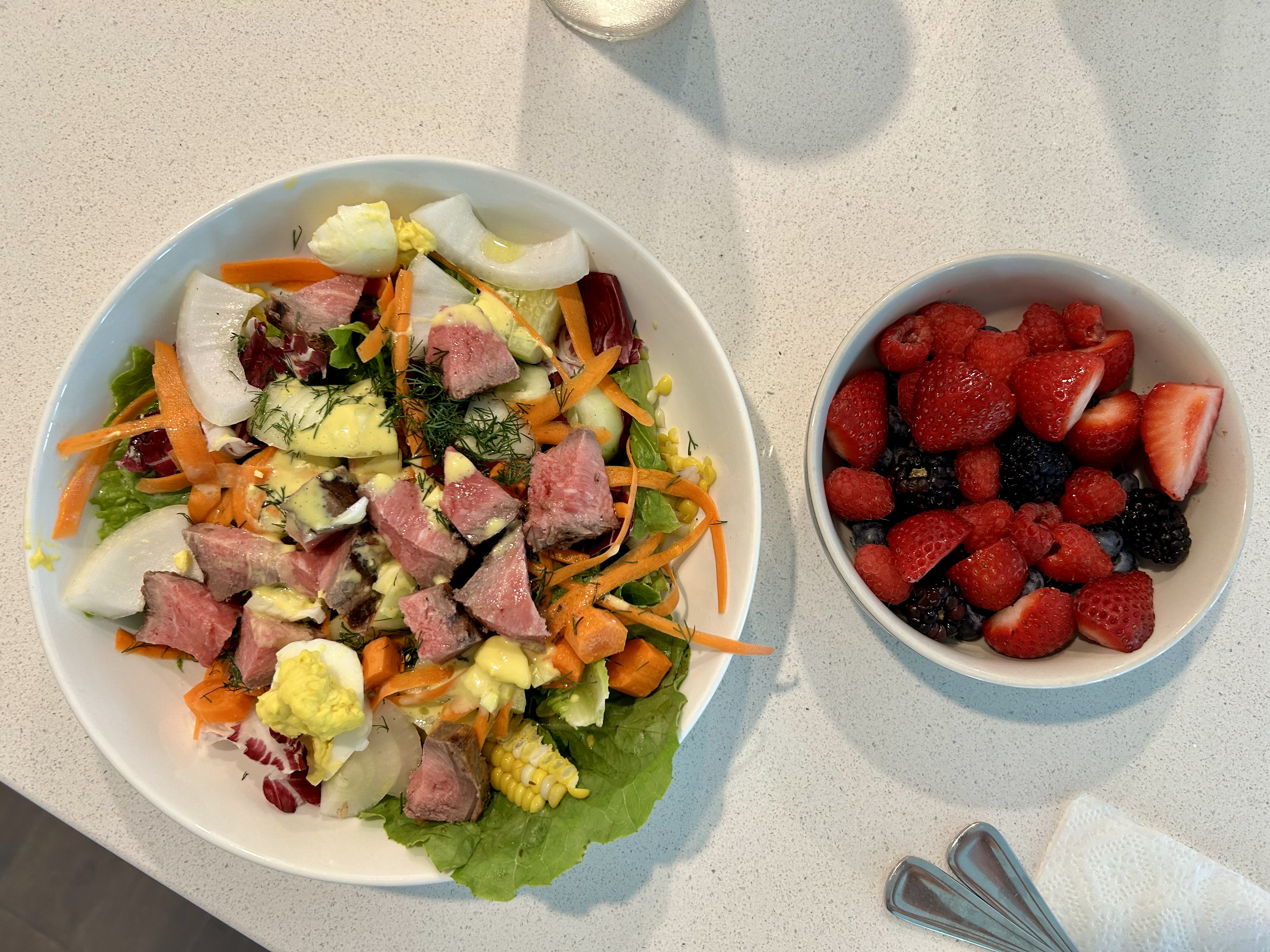 I made deviled eggs again this past week–I was, again, so hungry for them. And I put the broken ones on a recent salad made with some grilled steak leftovers. I’ve been able to eat my noonish dinner on the porch all week, as it has been cooler.