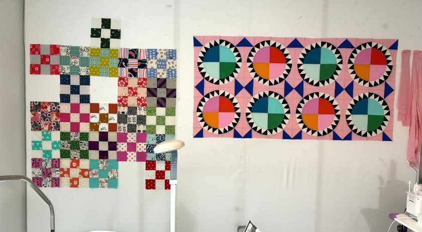 The leader/ender scrappy quilt on the left is…scrappy. It is made from the two bins of the 3 1/2-inch squares of Cotton+Steel/Ruby Star Society I cut up back in Maine: one neutrals and one colors. It’s just fun–and will make a cuddly lap quilt meant to be used and used. I will probably donate this quilt to the Patchwork Gals extraordinary efforts to give quilts to those who need them, like foster children.