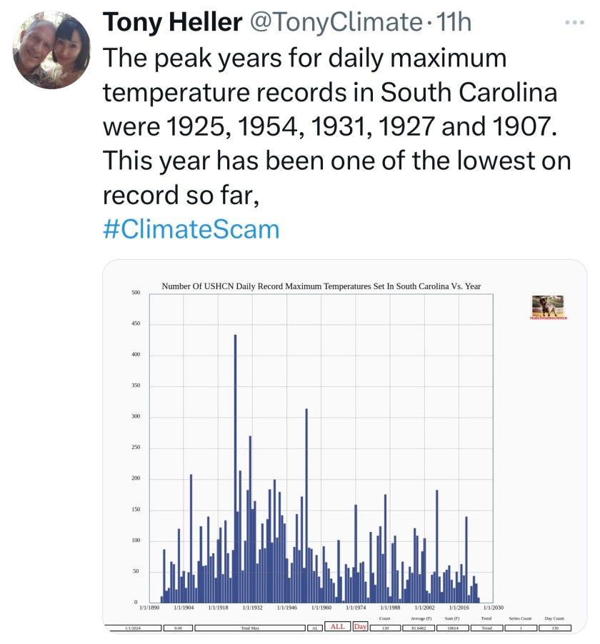 And, I saw this X post last night from Tony Heller documenting that it is actually cooler this summer in South Carolina. (The data is from the US Historical Climatology Network, which is a designated subset of the NOAA Cooperative Observer Program (COOP) network.). Heller has been putting up this climate data recently, state by state.