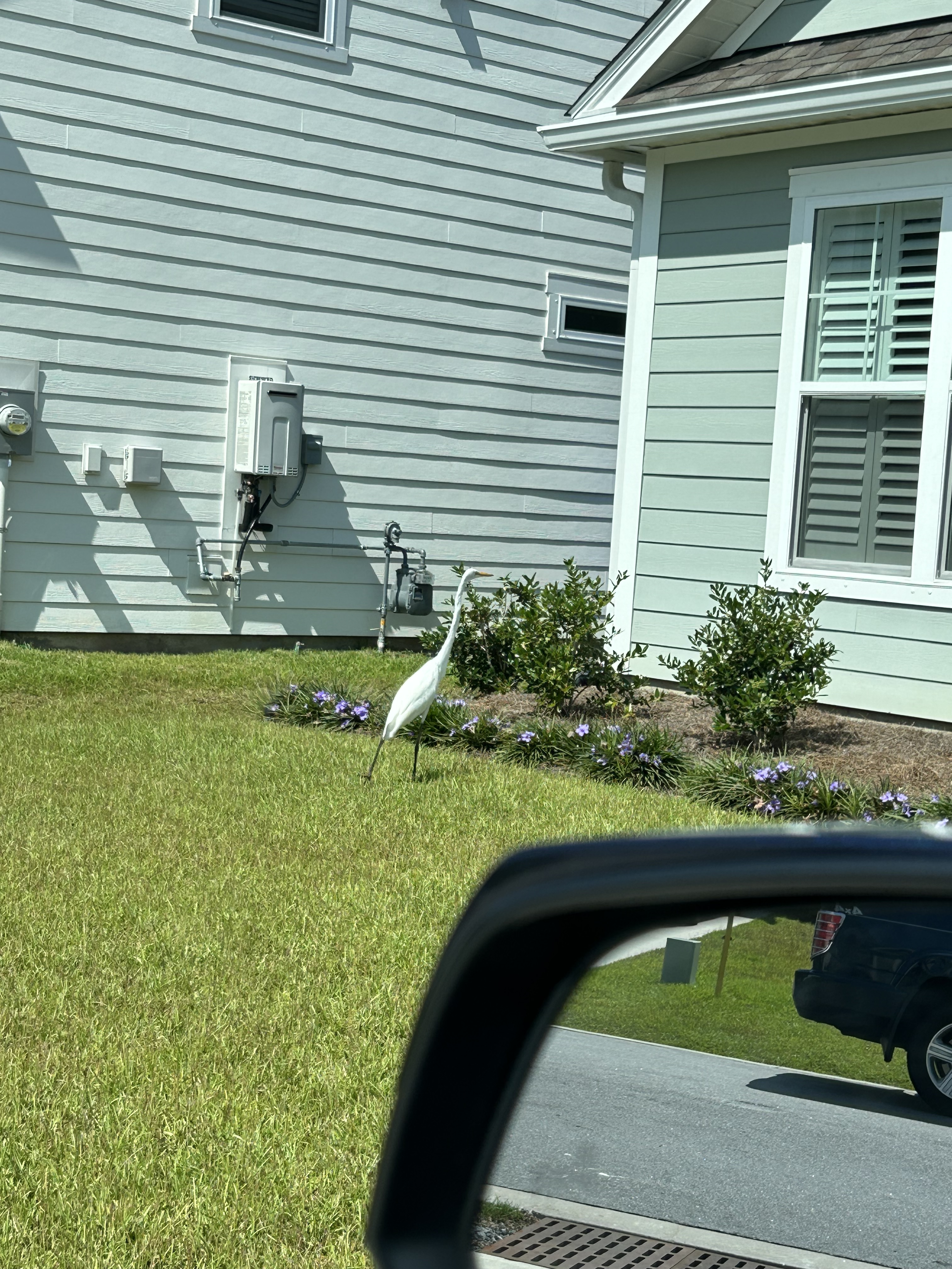 Look what was in my front yard when I came home from an errand yesterday. One of the Great White Egrets that are very common here. Note the short yellow bill, black legs, the long flexible neck, and the height.