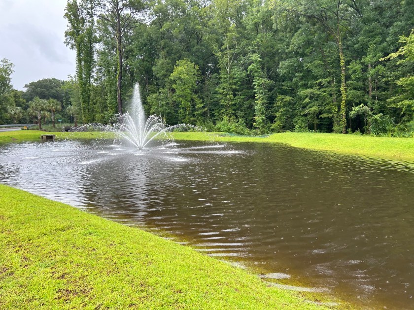 Debbie gave us a break most of yesterday afternoon and much of last night, so I went out to explore in the early afternoon, alongside many of my neighbors, many of whom were walking dogs that had been penned up inside for a long time. My back yard neighbor was really worried about the creek/bioswale running through our property rising up to a level that would come into her house. I wanted to see how all the drainage systems here were working–as this type of Low Country drainage is new to me.