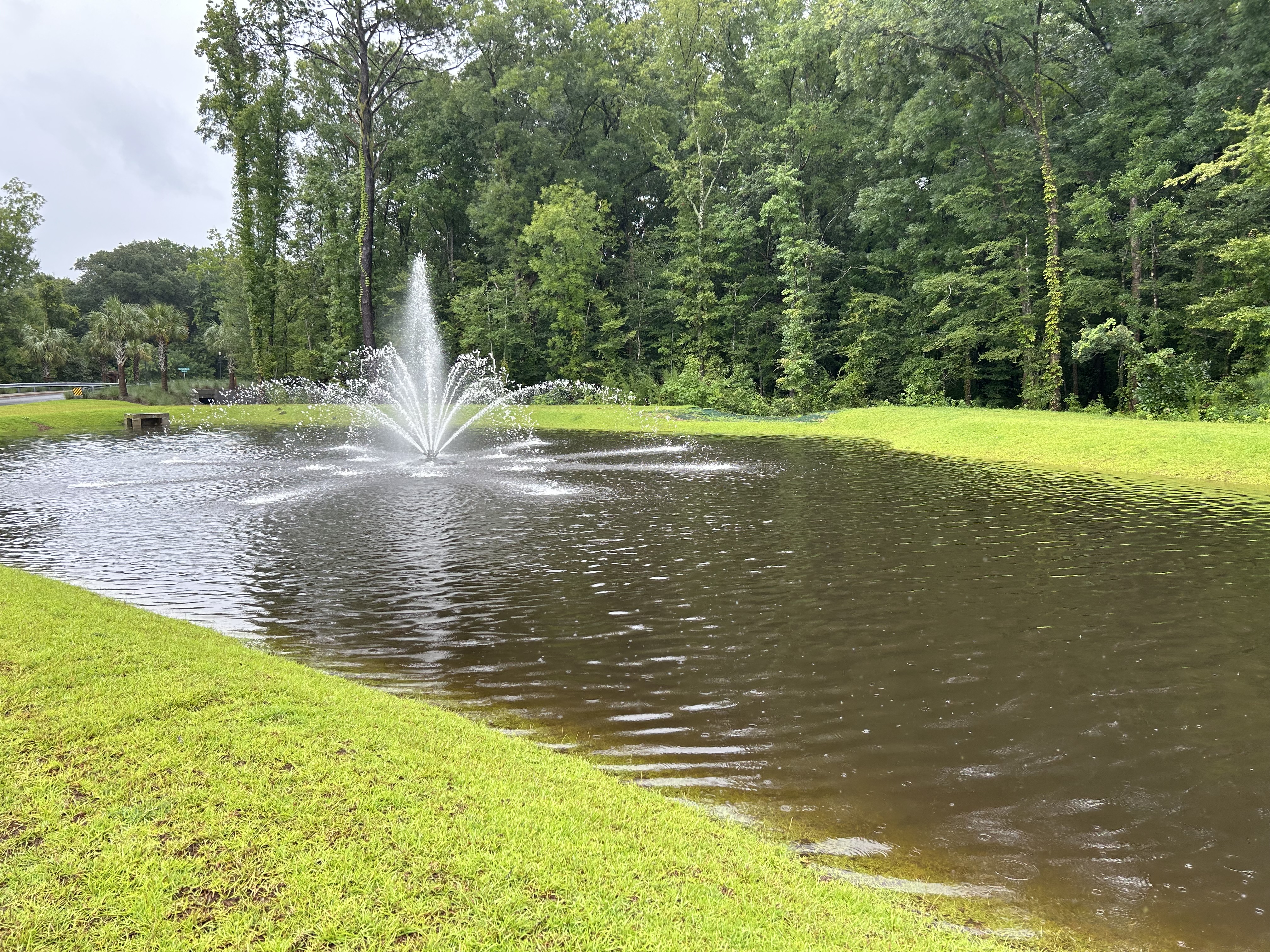 There are two big ponds at the front entrance of this property–the fountains in them are decorative, but the ponds are there to capture rain water. The one on the left is very full–you can see that the drainage platform in the front of the picture is now covered with water. But the steep sides still have a ways to go before overflowing would occur.