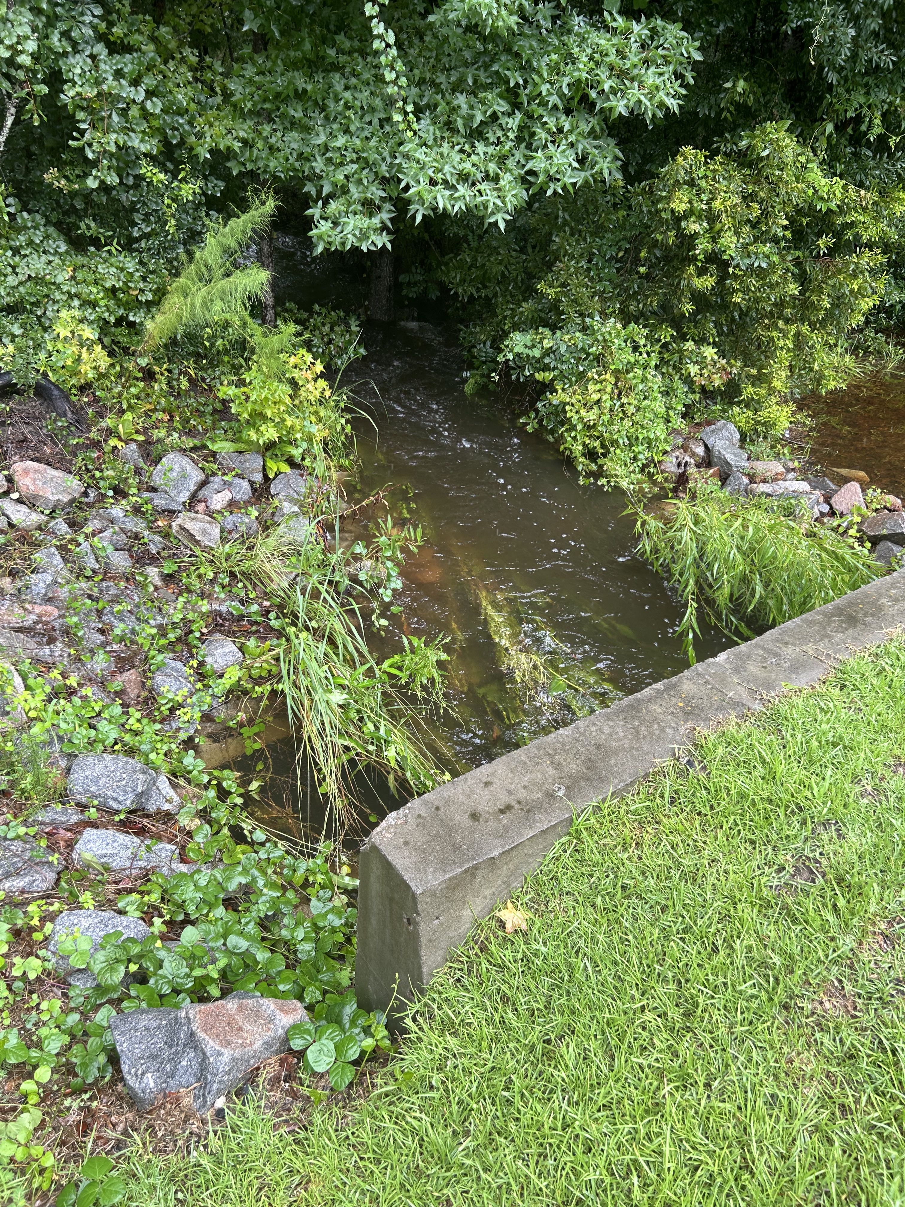 Our neighborhood has a LOT of depressions that are “dry” ponds until we have a storm. There are about six or seven of these depressions scattered about the property, and a few hold some amounts of water all the time. This one is by the mail kiosk is usually dry. Now it drains into the creek/bioswale on its far side.