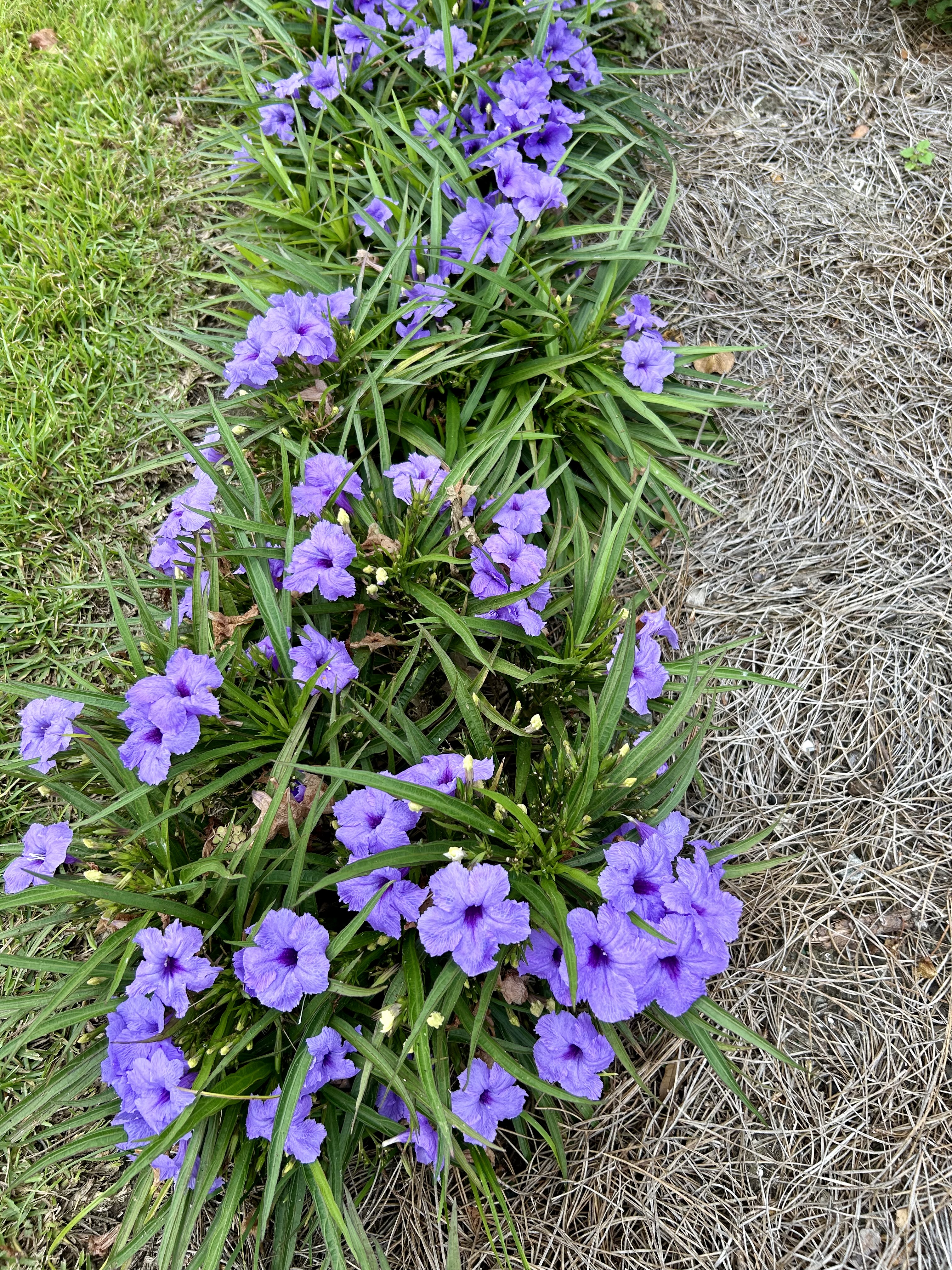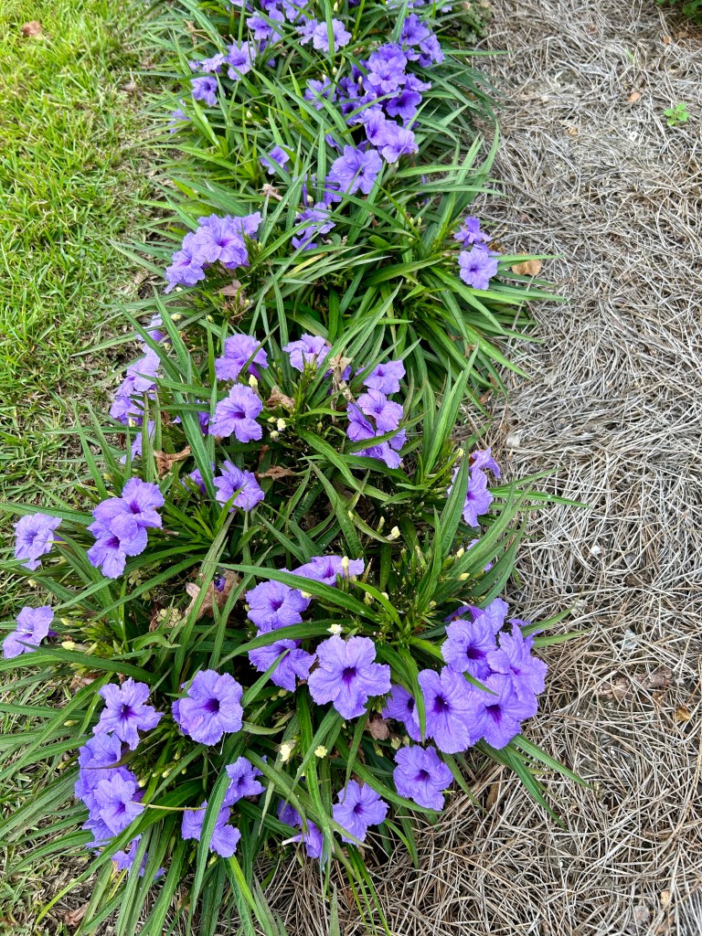 These dwarf Mexican petunia plants I planted last year are an unqualified success. They bloom for all but the coldest weather and are gradually filling in the areas that need filling in–like where I took out some Mondo grass on the driveway end of this bed.