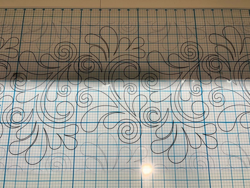 But once I got organized with this panto, I found it was fun to use–all those cute swirls. And it lays down what would be a double/wider run, which means a more intense run, but double the amount it does on the quilt–so less runs to do.