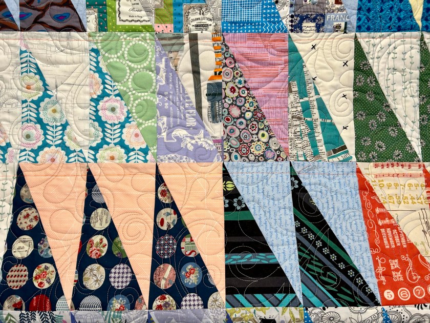 It took me a while to quilt it as I had planned to use a daunting pantograph for the first time: “Nemesh’s Feather Grande” by Bethanne Nemesh.