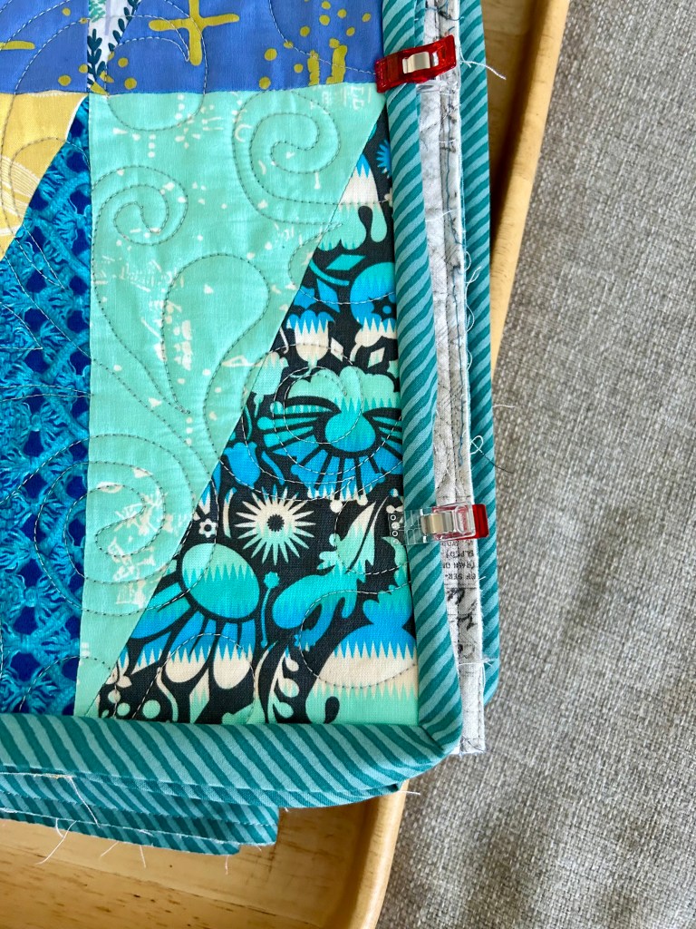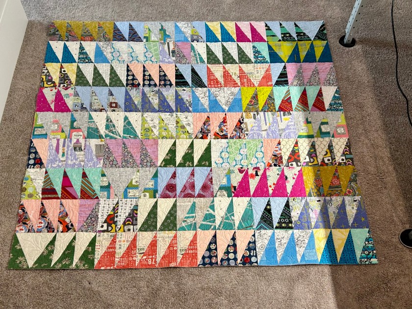 And here is “Arrowheads” all trimmed and bound and ready for me to sew down the binding. I lay out a quilt on the floor to lay out the binding so I don’t play “binding roulette” with where a seam falls near a corner.
