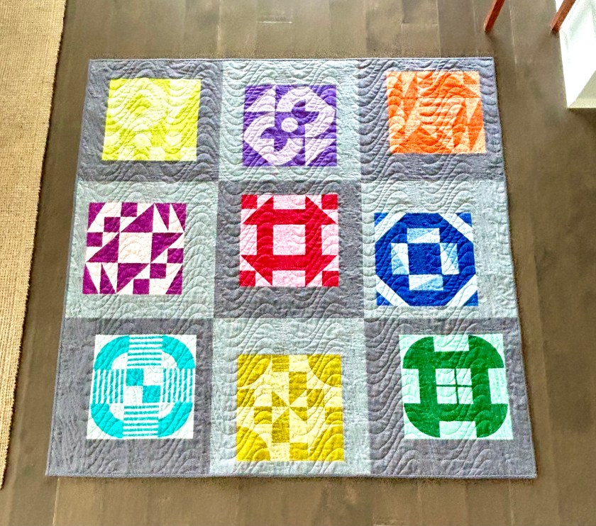 Here’s my effort. The Churn Dash block is a 9-patch block, so I made 9 blocks, using the three elements in the Churn Dash block, to create each of the blocks below. And I had a super good time doing it too. The quilt is now a big 9-patch.