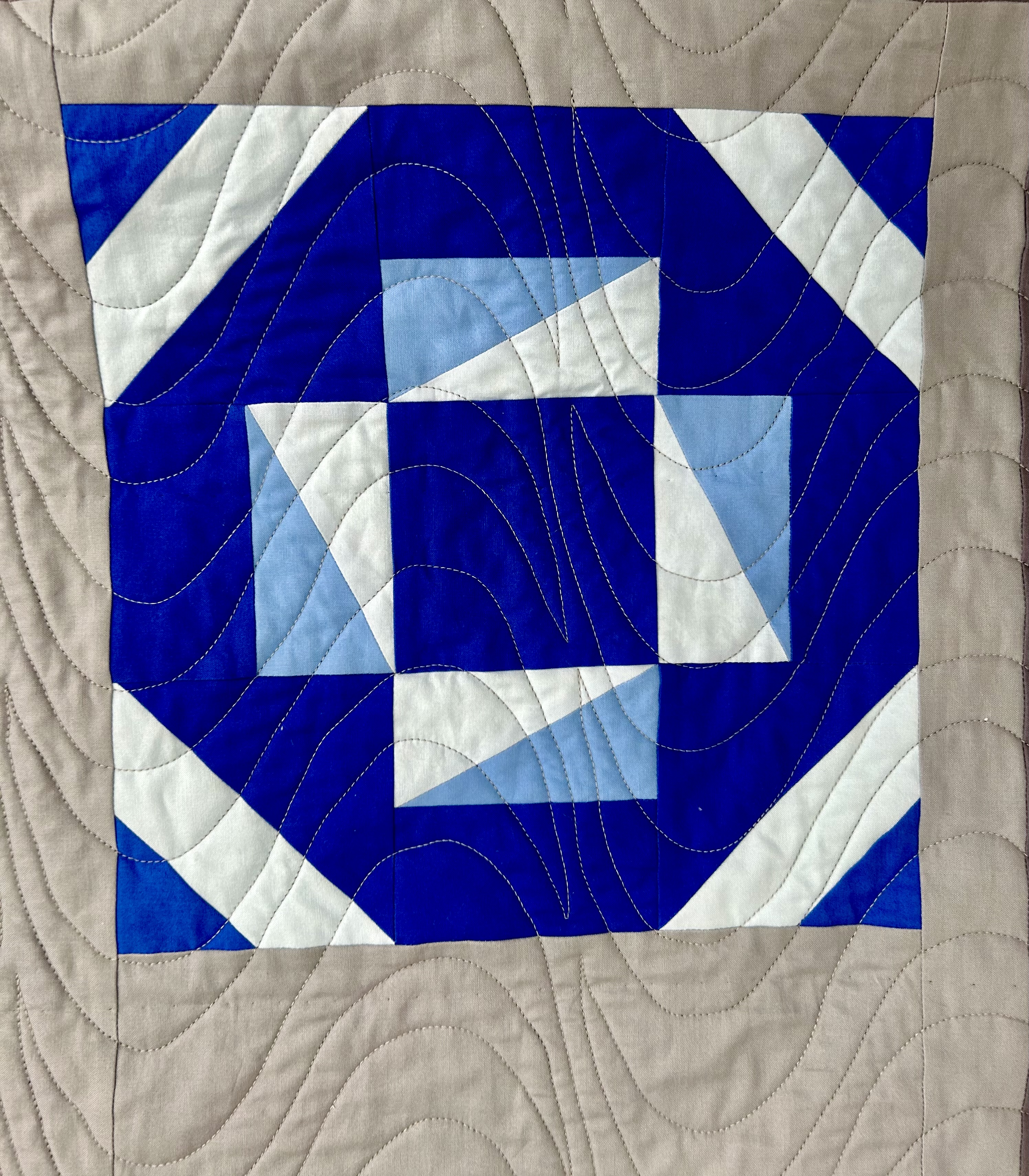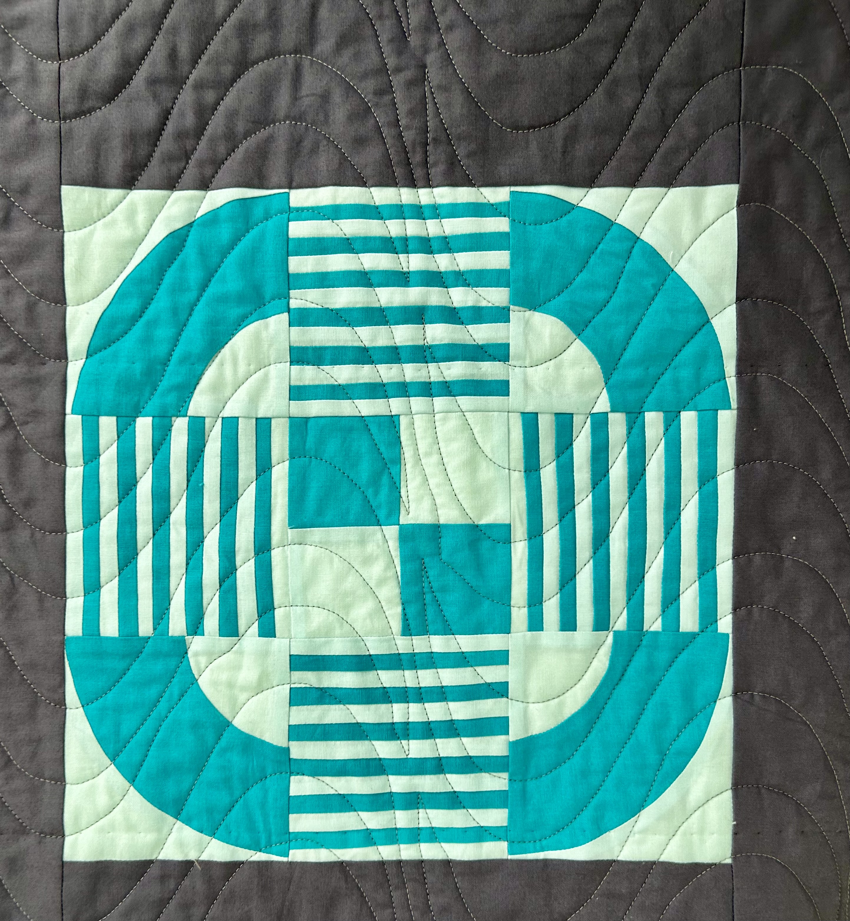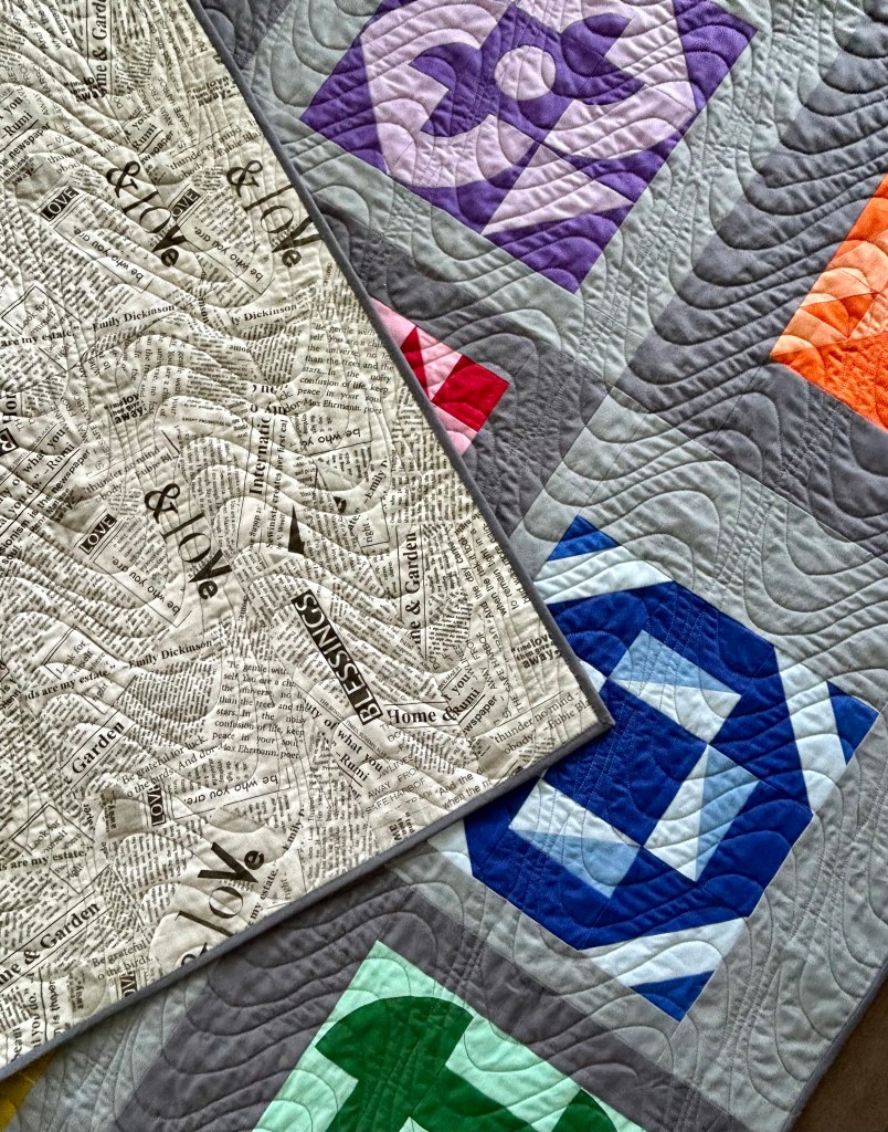 Here’s the backing, before I go on. The pantograph is New Wave, from Willow Leaf Designs, sold at Urban Elementz. But I had it made a bit larger than the regular one. (Thanks Urban Elementz.) (And thanks to longarm Canadian quilter Wendy Currie for suggesting this pantograph.). I quilted with a medium grey cotton thread from Signature. The larger panto version was trickier to use as it has a long, long stretch in one place that demands total concentration and steady hands and the need to be bodily positioned to make that sweep without pausing.). Still, you don’t really notice my bobbles unless you are super picky–the panto just blends everything together in its intensity. It provides beautiful texture.