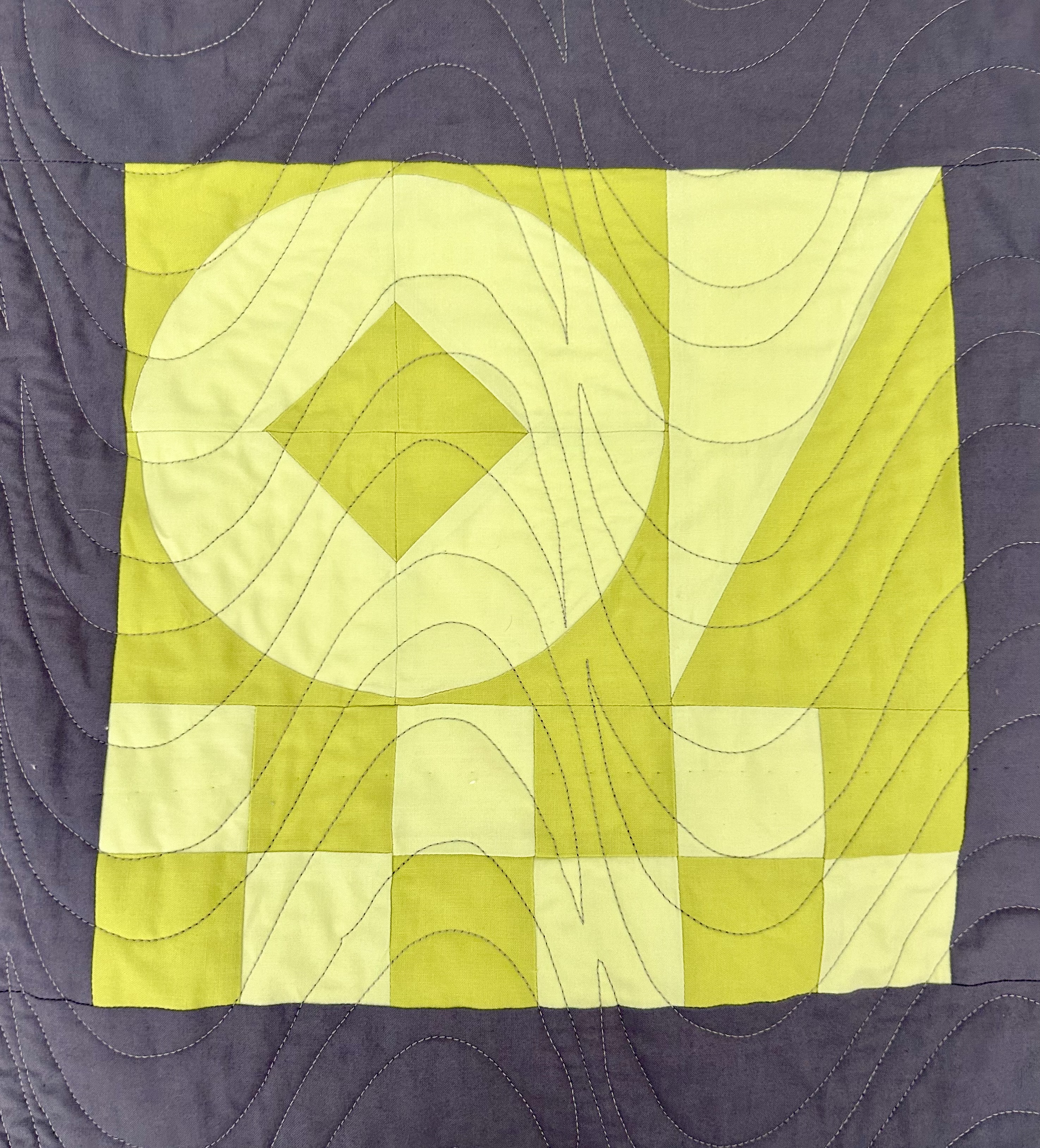 Below, the corner half-square units are intact, and the center has a circle in the middle (inset circle method learned in my Blocks 1 online Tara Faughnan class last year). The side rectangles have become curved. But, what a cool block this is! I love it. And I love that it came along inside some play time.