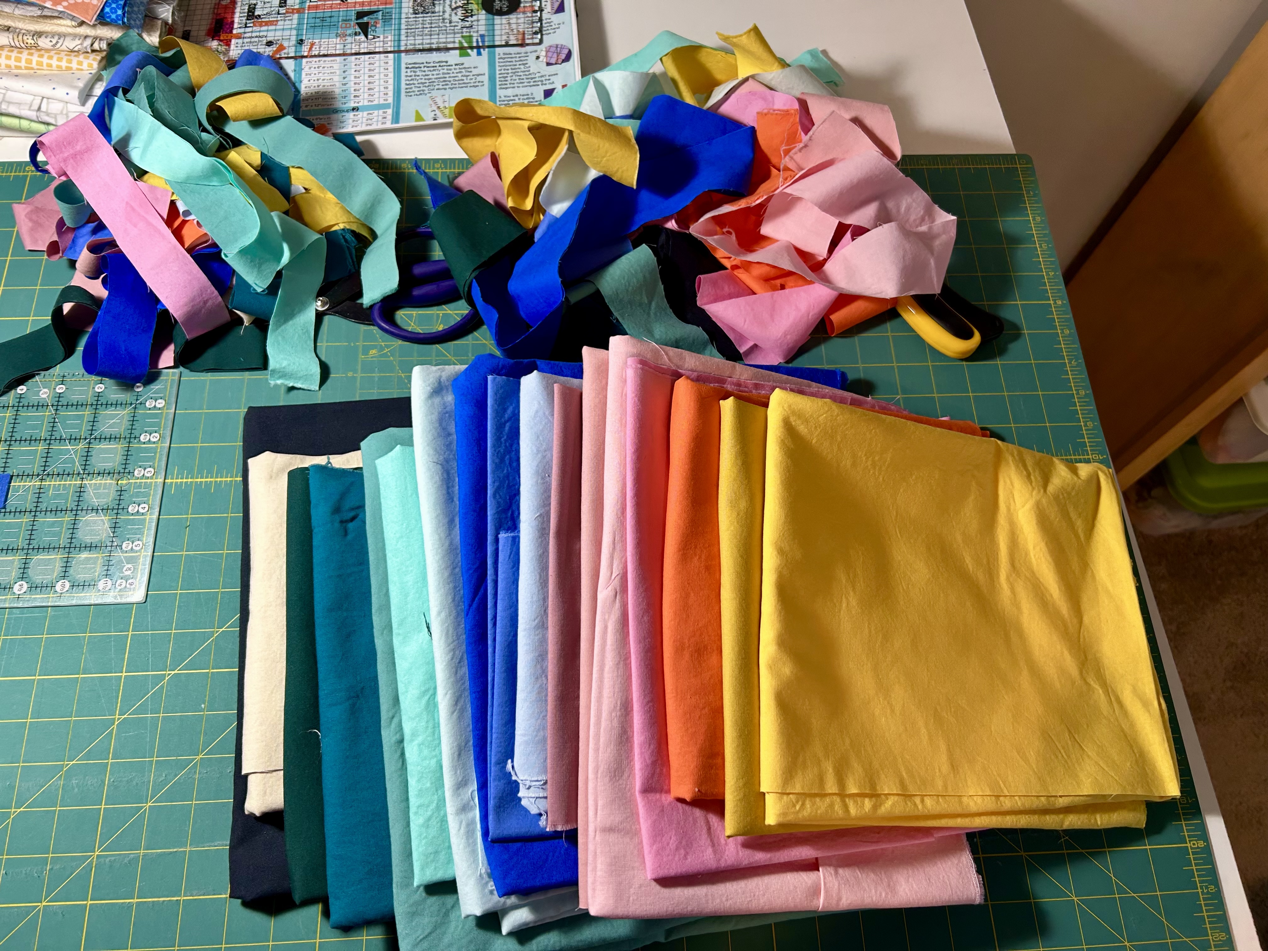 Here’s the palette I pulled–and I did order a few of Tara’s colors to fill in what I was missing in my stash. I added–as suggested–the warmer/softer black Kona “Pepper” and the neutral Kona “Putty” as suggested by Tara. I’ve long been a fan of “Pepper” and had some here, but “Putty” was new to me, and I wouldn’t have chosen it on my own I don’t think. But it is PERFECT, lurking there among the neutrals one could choose.