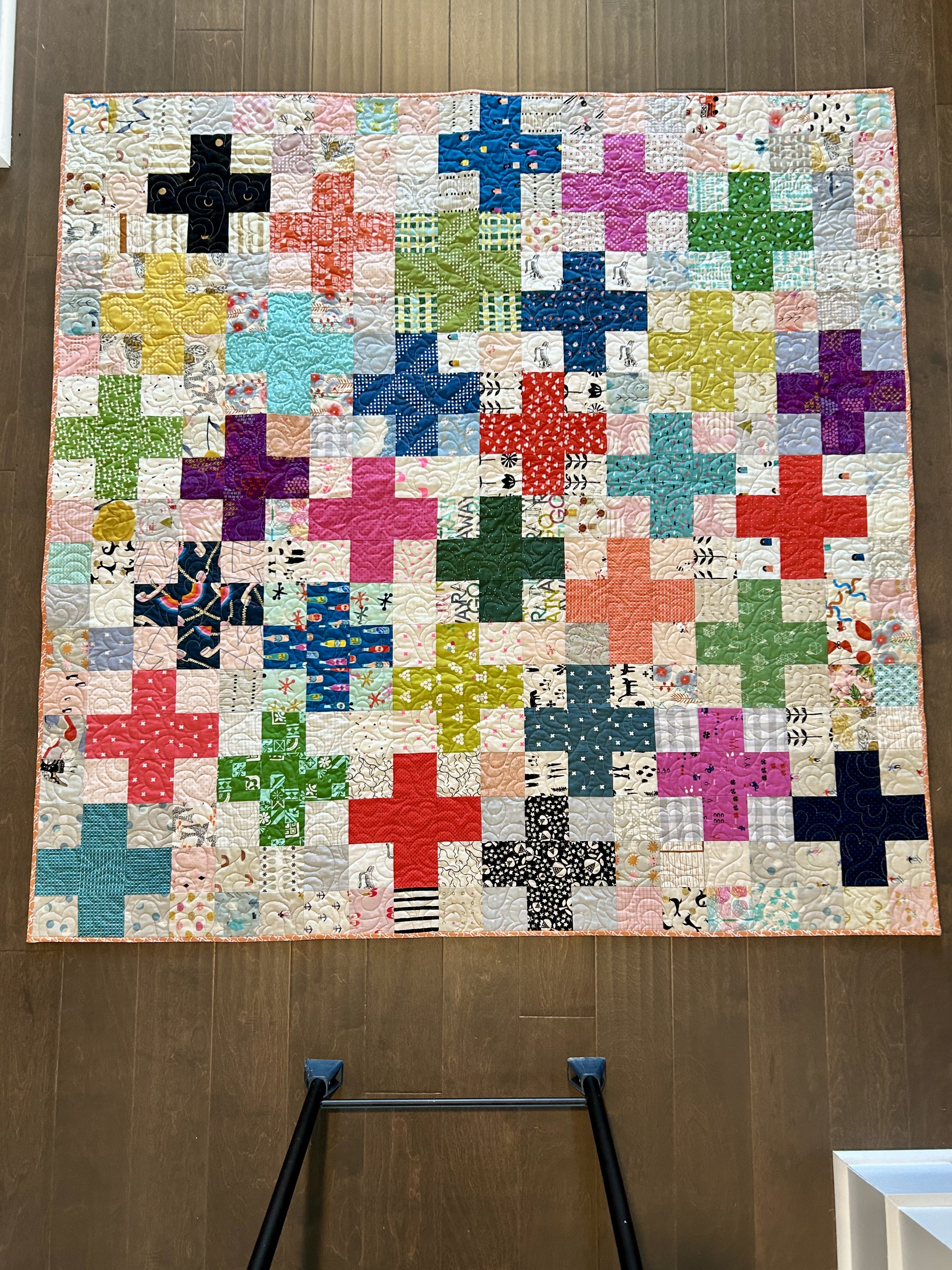 “Pot-Pourri 5: Crosses” is finished. This is the TWENTIETH quilt made from the cut up Cotton+Steel/Ruby Star Society fabrics in my stash–cut about 5 years ago now. I went back this morning and added then all up. They are all out of my house, with a one exception–the EPP quilt I made by hand. I gave these quilts to various members of my very big family and friends network.
