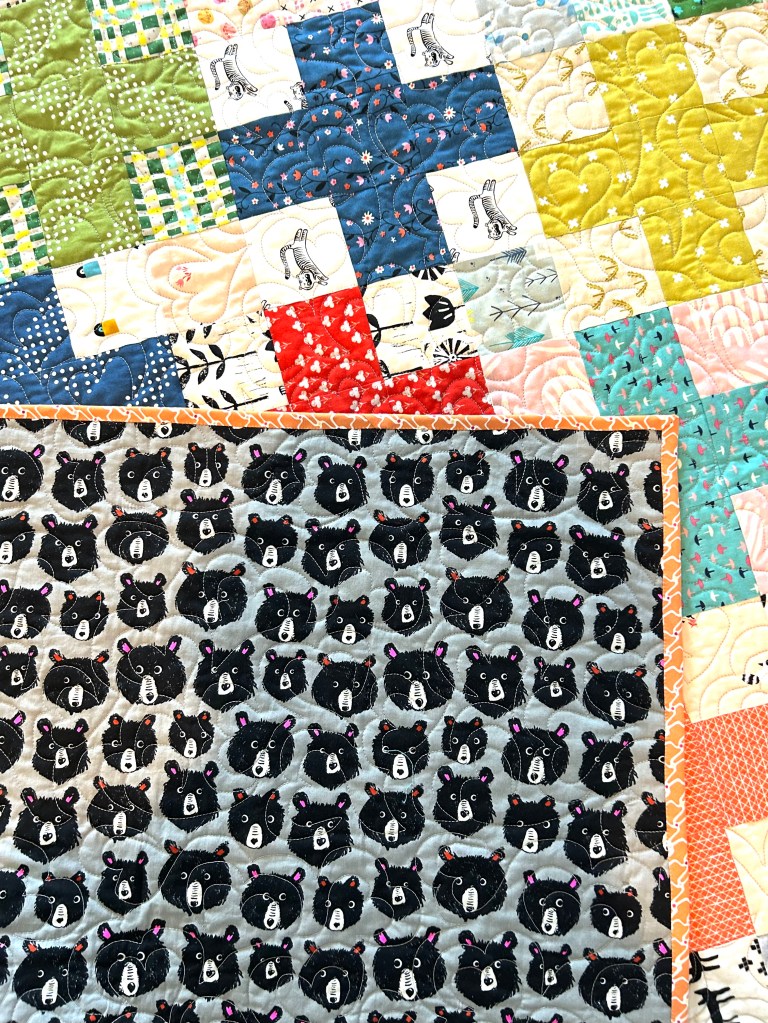 I used a fun pantograph called “Folk Heart,” which laid down a really nice texture. I quilted with a pale grey thread, which disappeared up front, but shows on the this adorable backing from Ruby Star Society. Their bears are back… And the bears have always been some of my favorites. A light orange binding–not C+S or Ruby Star–does not distract but picks up the orange spots in the bears’ ears.