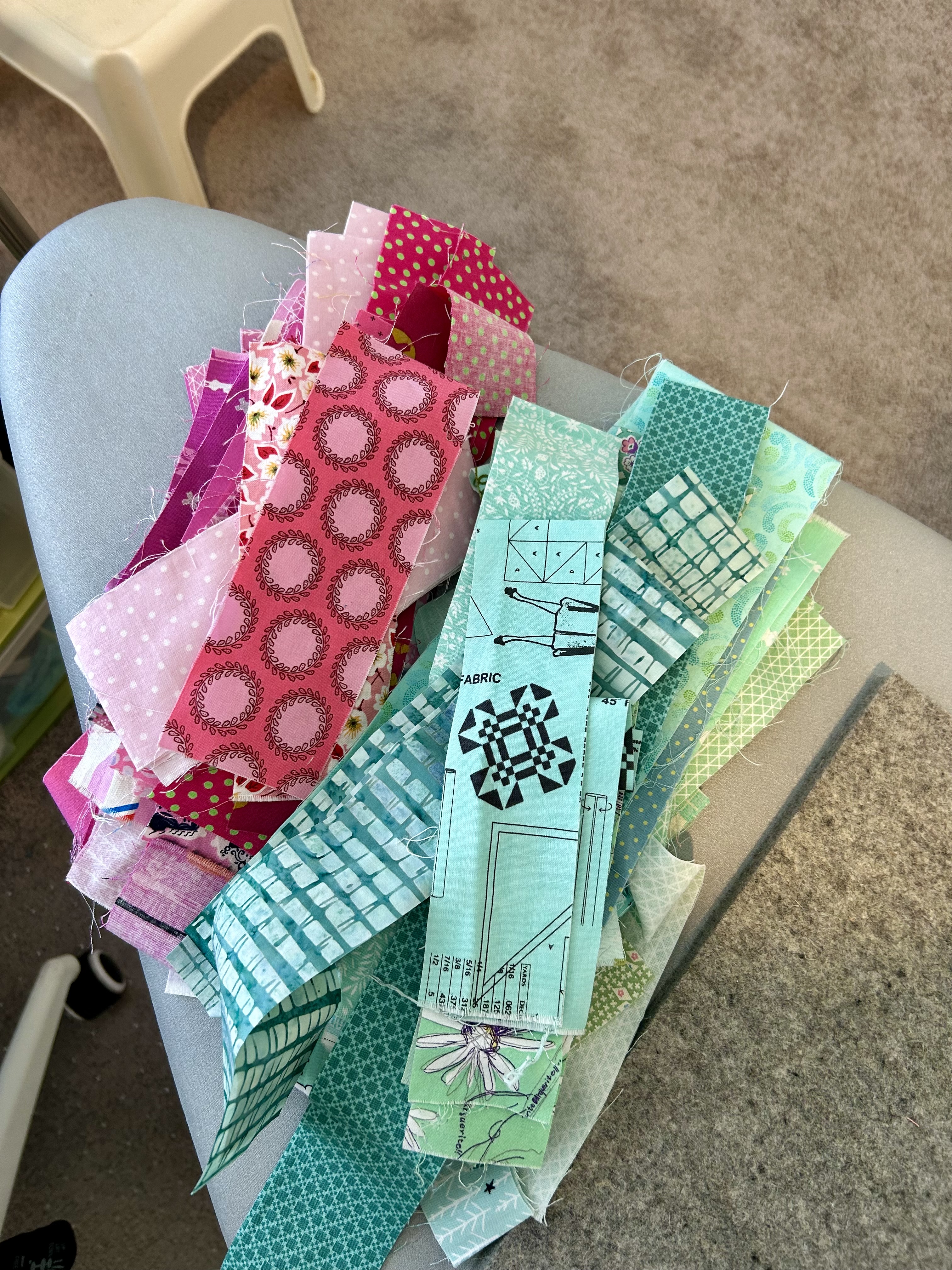 This project DOES chew up a ton of fabric strips–my bins of cut strips are…going down.