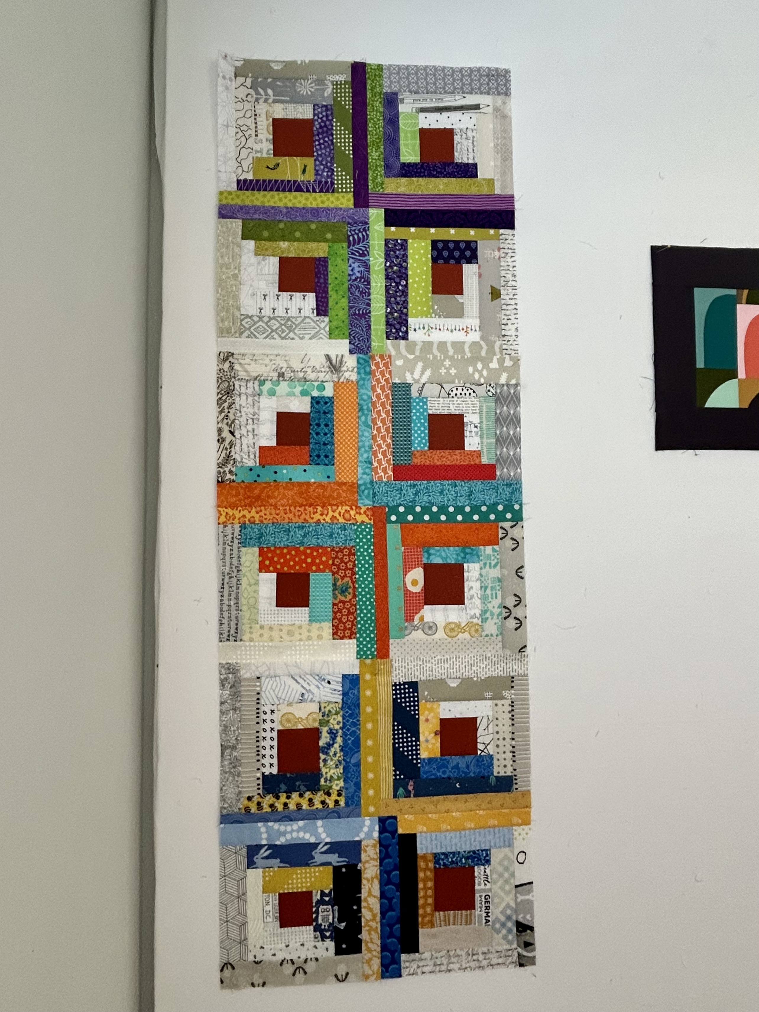 I have three 18-inch blocks of Rachel Hauser’s log cabin sew-along made. Nine are needed. These blocks are strong colors–opposites on the color wheel which gives a lot of punch. They won’t stay together. Indeed, I’ll make some softer versions now.