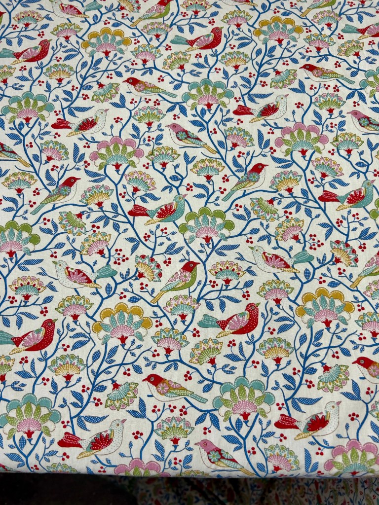 Below see my very FIRST Tilda fabric–bought for the Dancing Diamonds (third in my half-rectangle triangle block series) that is draped over the longarm in the picture above. (And which is now being quilted.). ***(I finished the quilting on Sunday late afternoon–post to follow soon.)