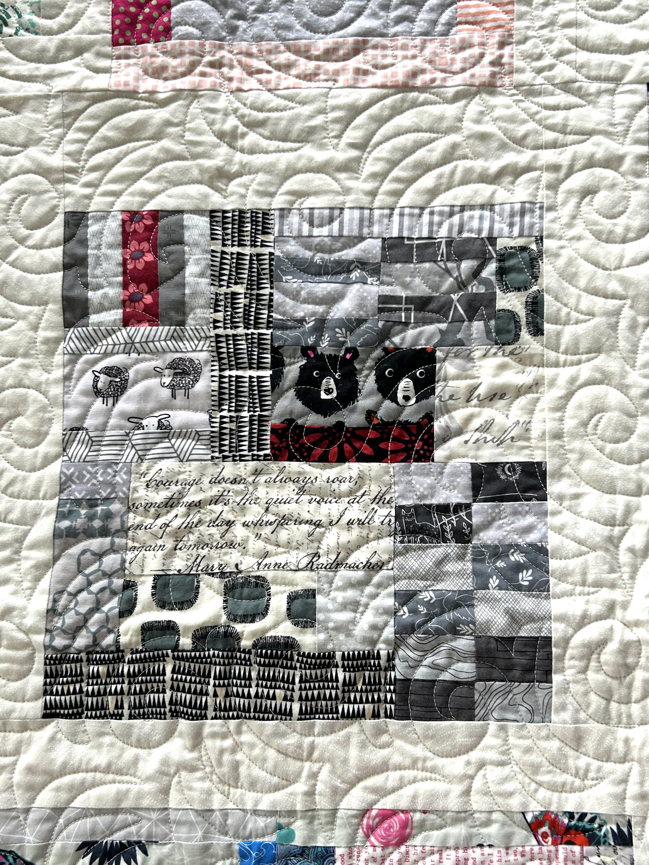 And, the scrappy log cabin quilt done during Rachel Hauser’s Sitched in Color online sewalong–Scrap Cabin–is on the longarm. I haven’t named my version of this quilt yet.