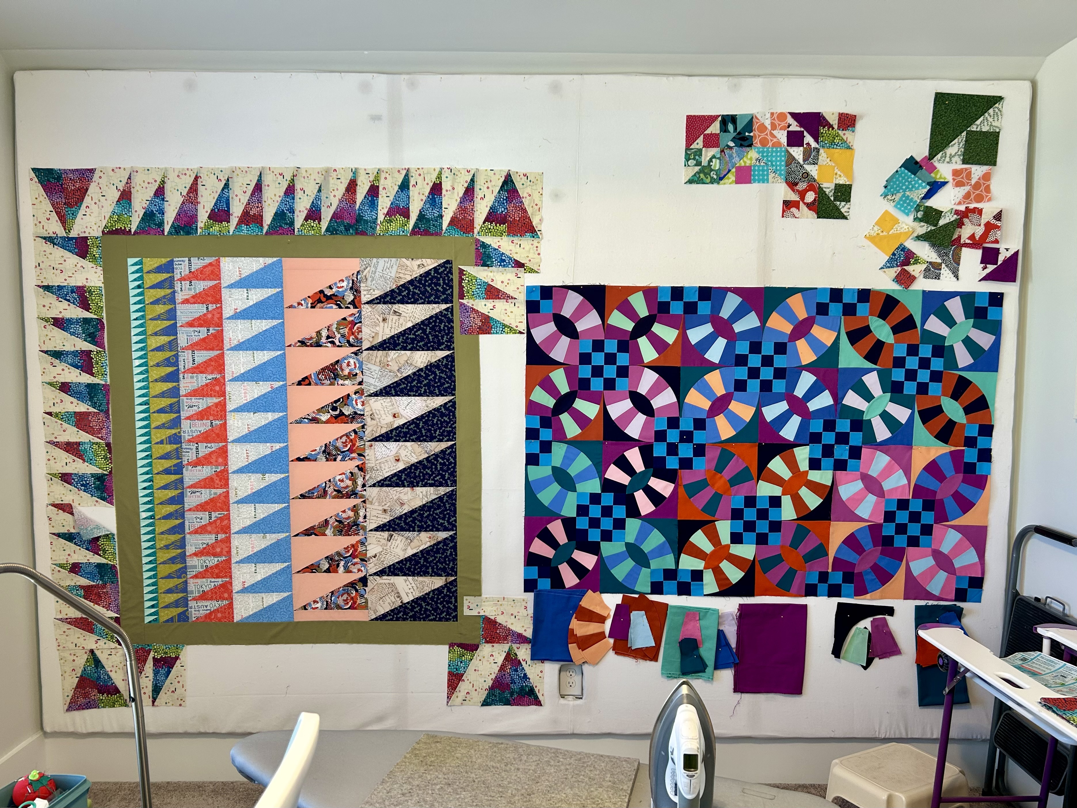 The quilt on the left is the 4th and last of my series on the half-rectangle triangle ruler made using Latifah Saafir’s Hurty ruler: “Gradations.” The outer border is working well–all the pieces are cut and sewn, and I’m really liking the fabric choice. So far, the math for this border is…mathing. Whew! I’ll sew more of that final border later today. So, this quilt will be off the design wall soon.