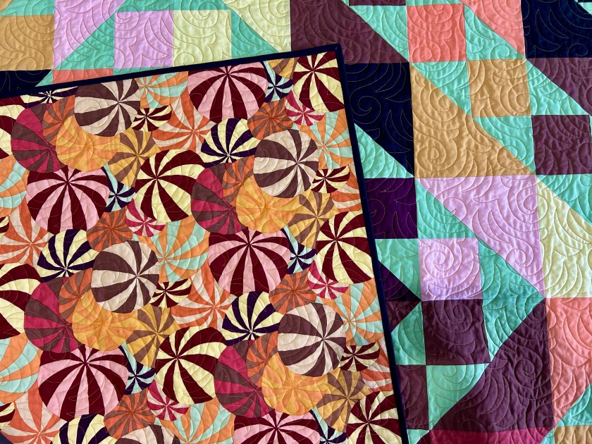The backing is WILD! It’s a wideback print that I used on its side so I had to buy less fabric to cover the back–and I have the leftover fabric from the edge in my stash now. To compare, that would be 5 or 6 yards of 44-wide fabric (depending on the print drop both long and wide) versus 2 or 25 yards of a wideback. Using a wideback this way if the print allows is…cheaper.