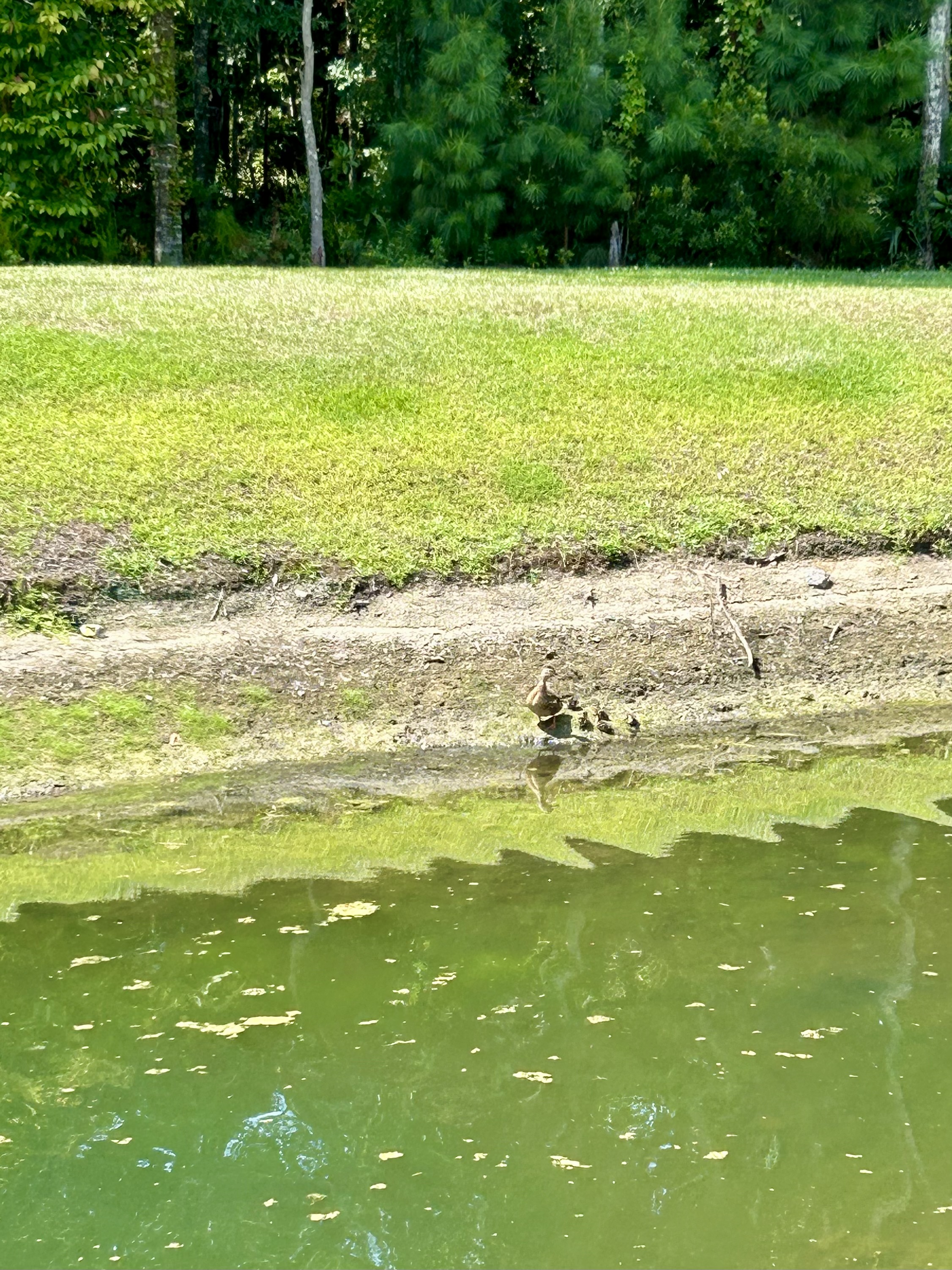 My neighbor checked this morning, and the duck and her babies are all still in the front pond. So I walked up to take some pictures.