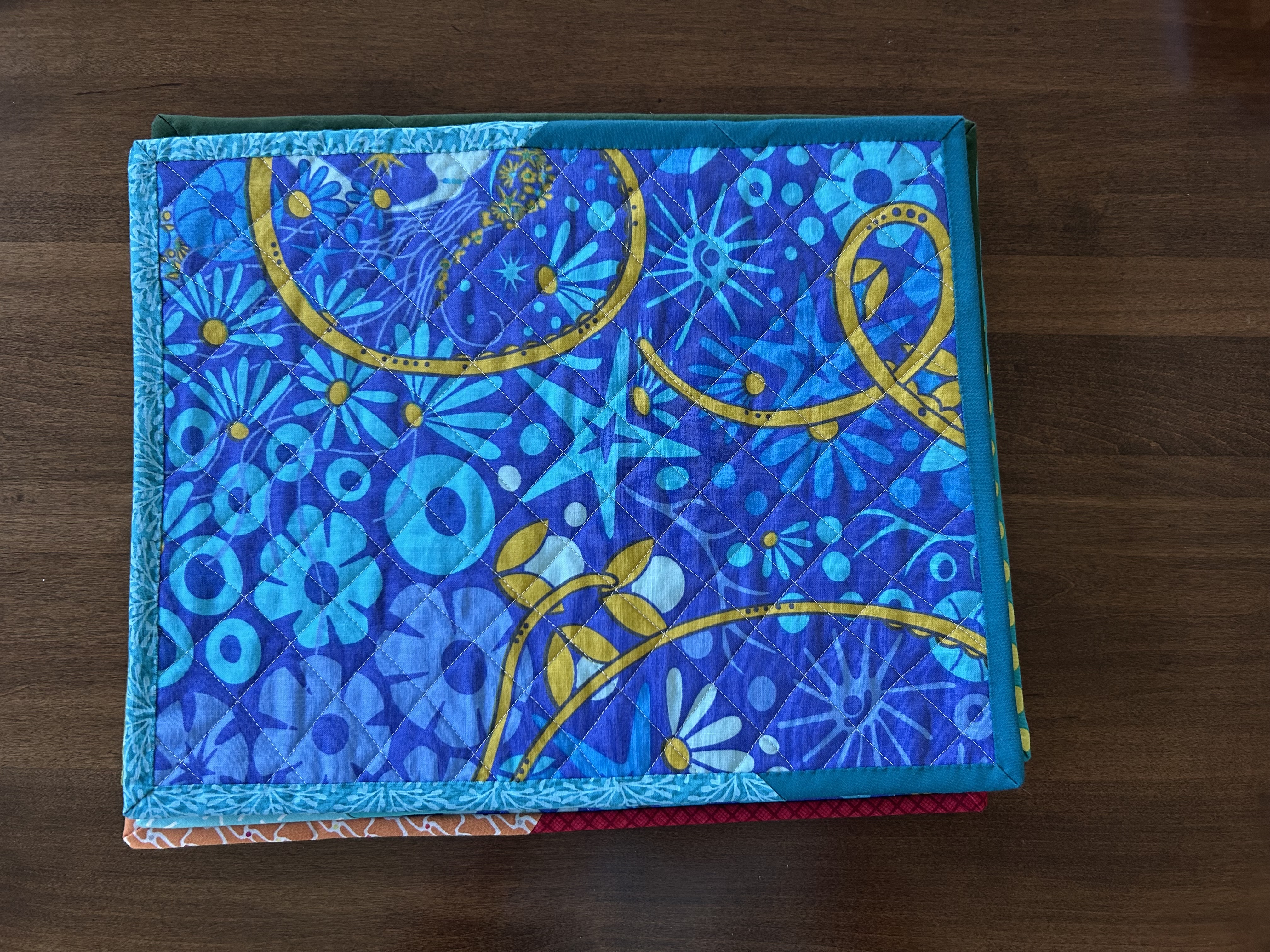 BUT, another goal with this project is to figure out how to install binding on BOTH sides with my sewing machine. I have been lousy at that task. Yet many quilters here that I know do this work beautifully. I tried with the placemat you see on the top. It was…terrible. I had to take the whole binding off and start again and to sew down the binding by hand.