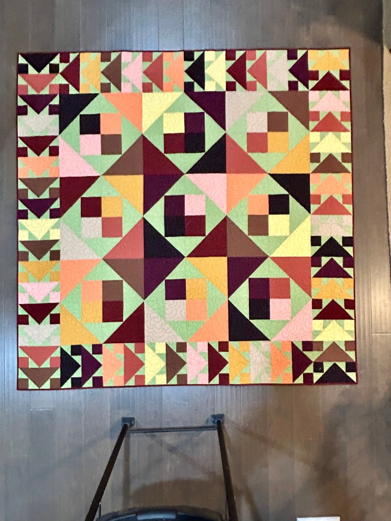 And here’s “Summer’s Solstice”–also made with the Cat’s Cradle rulers using 4 inch and 8 inch blocks. I had thought to use the small blocks like sashing between the large blocks, but that didn’t work for me as it was way too busy.