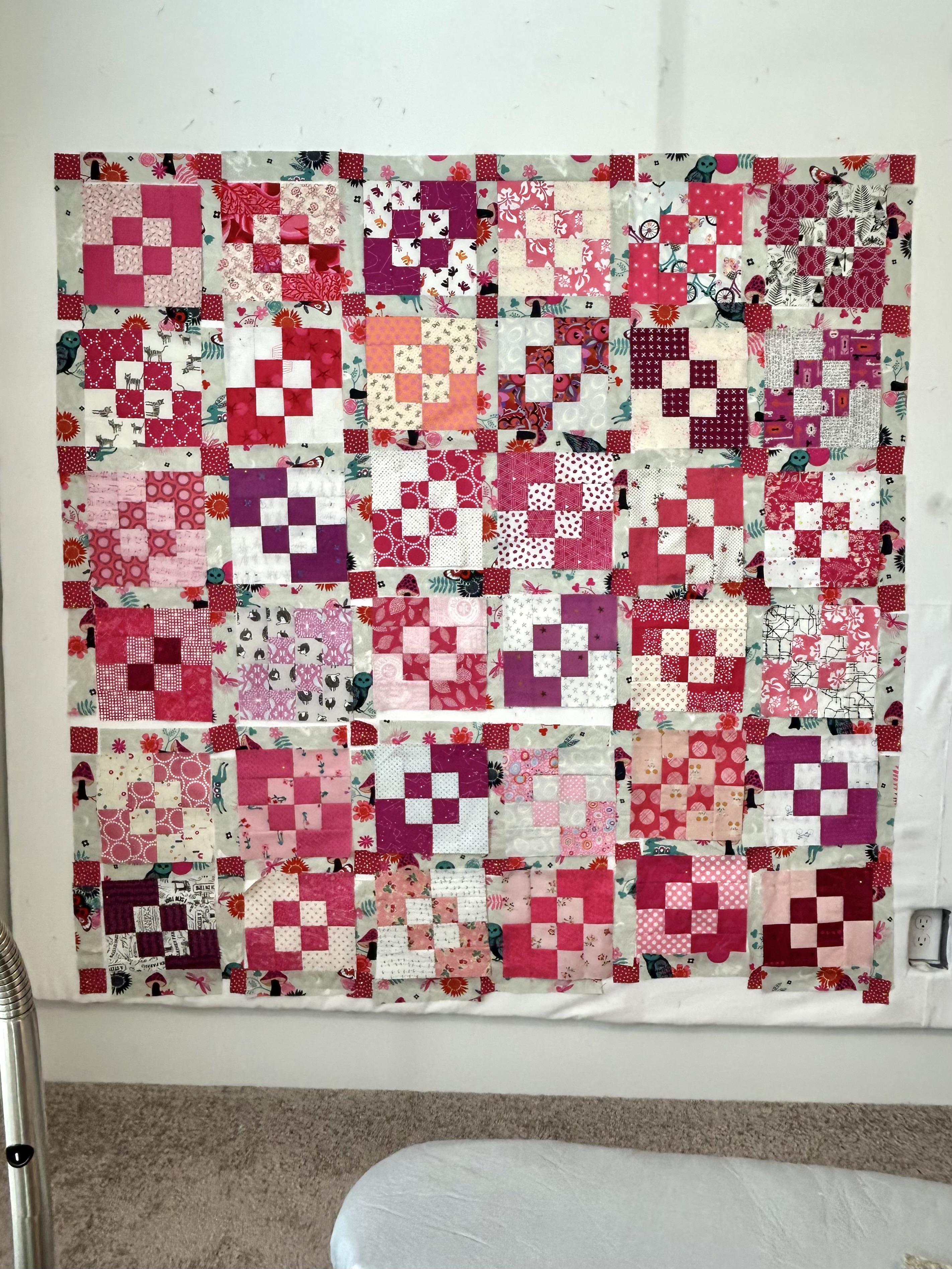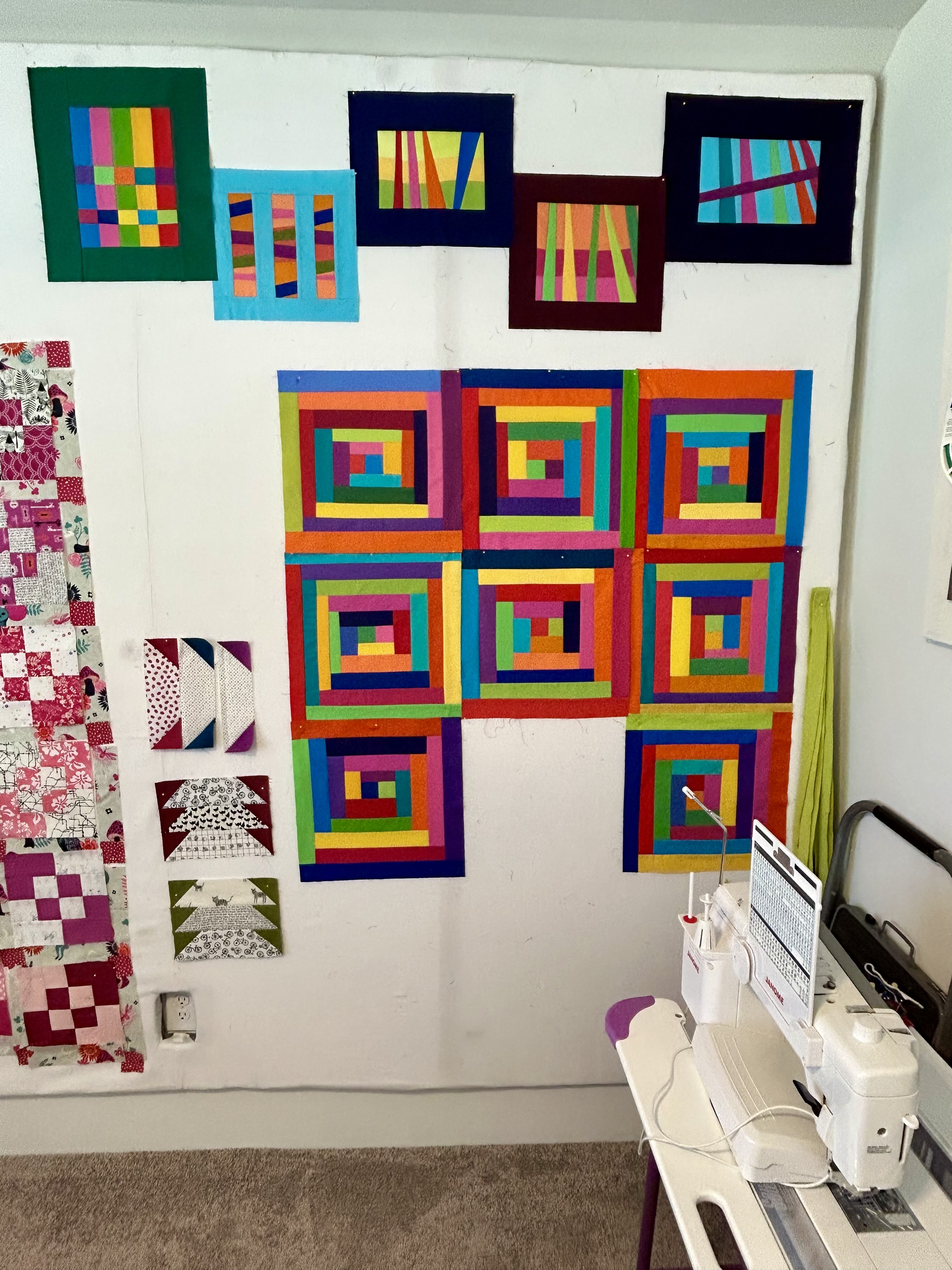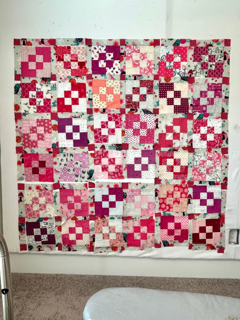 “Four Patch Fun 2”–made with the free 8-inch version of Bonnie Hunter’s 2025 leader/ender block, released in July–is ready to be sewn together. Note that I used the setting version that adds sashing. I might still be moving blocks around–I moved some yesterday–so I’ll let this one simmer a few more days while I play with other design wall projects. (This quilt’s destination will be a baby girl who will arrive in my backdoor neighbor’s home late November–and this quilt will be the third that I have given to new babies in our neighborhood.)