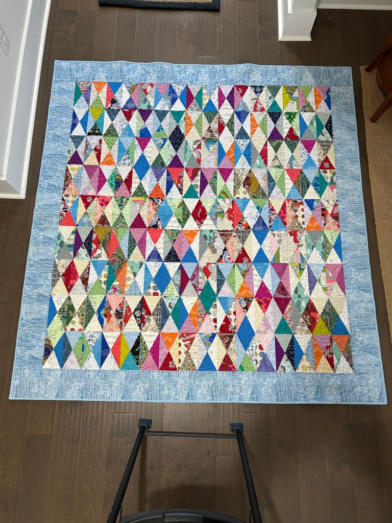 Here’s the big quilt I made–it’s a good lap size. One’s eye forms diamond images big and small everywhere if you slow down and just look at it. Eyes can make the most amazing patterns, which is a whole other subject.