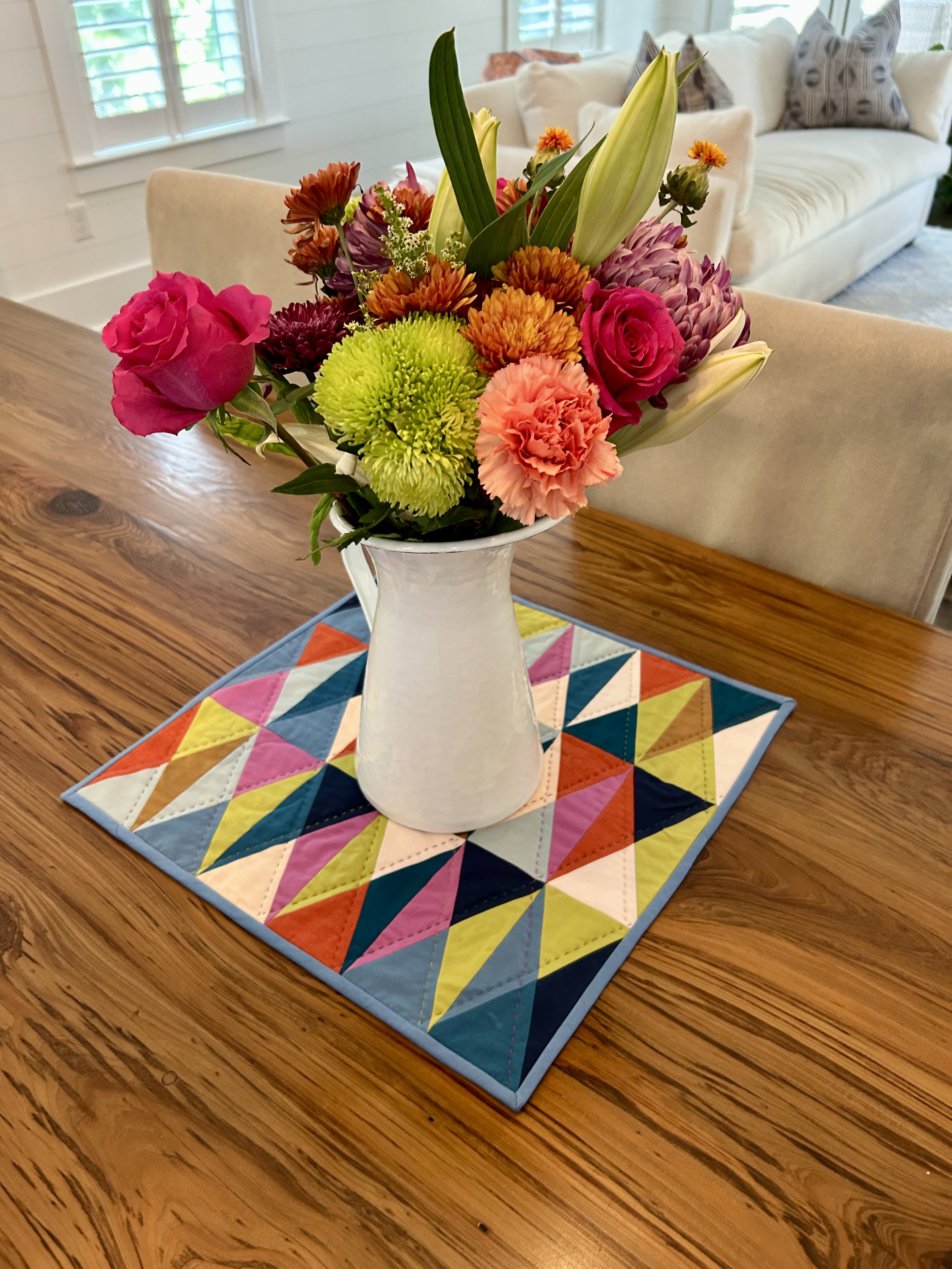 I gave my DIL this little pieced quilt last year during the Blocks 2 (Tara Faughnan) class–six months of playing with fun quilting ideas. Sometimes we forget how pretty the things we make are. I had such fun hand quilting this one, too. Plus, it was nostalgic as Blocks 3 just started this month.