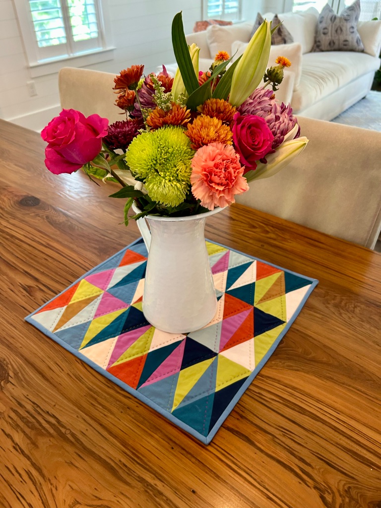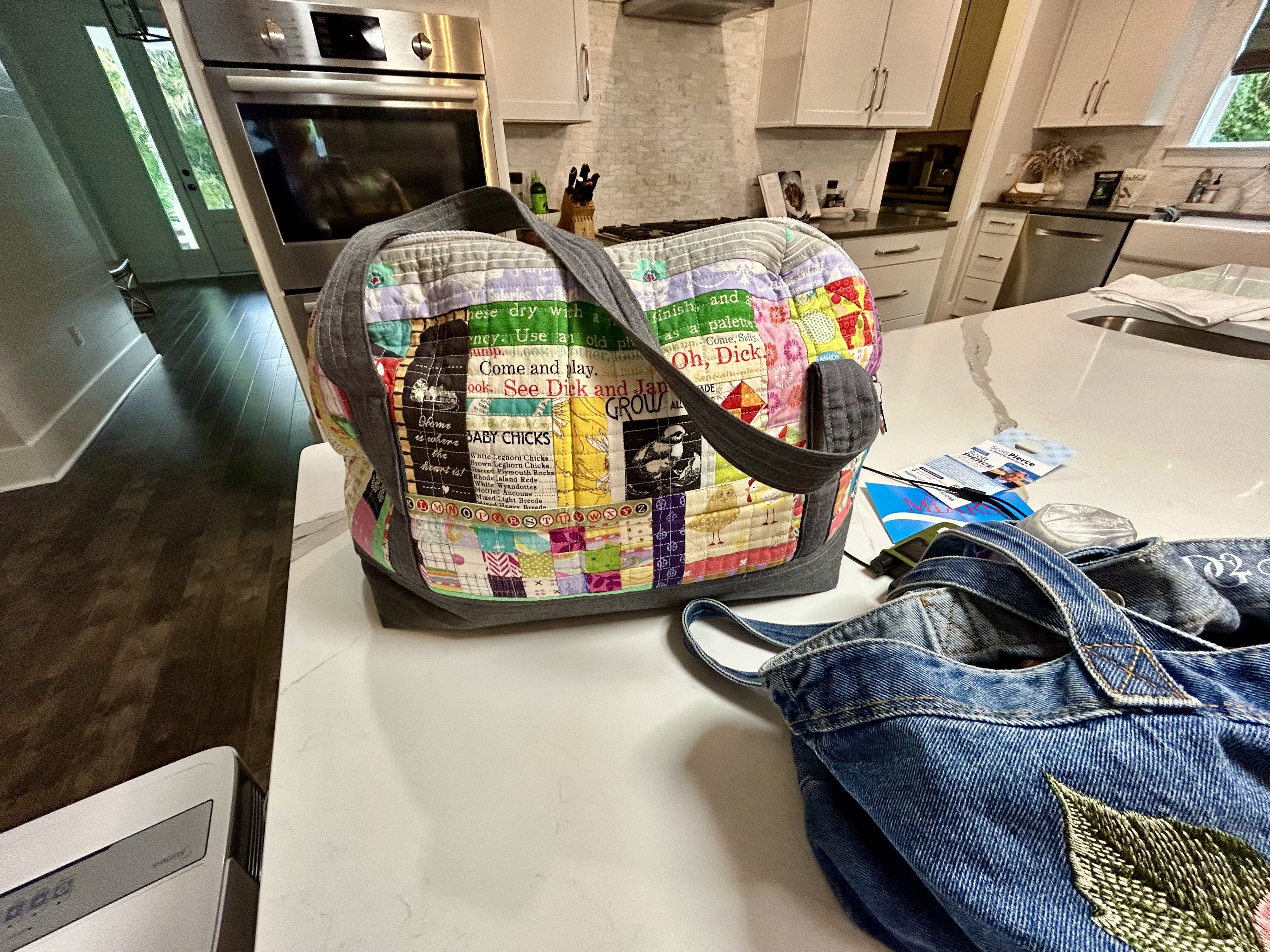 2. Your little quilt does add such a pop of cheer on the table, so precious! The larger version is gorgeous; I love the border with the colorful diamonds. The overnight bag is great – that Dick and Jane fabric is perfect for it. Did you make the denim piece as well? Is that a jacket or a bag, I can’t tell. I love when people have handmade clothing or bags. One of my Guild members brought two “Mary Poppins” bags that she had made to our “Show and Tell” this month, they were great. Enjoy your rainy day – we sure could use some. The trees are struggling this year and I’m afraid the fall foliage won’t be as colorful. Mother Nature may surprise us though! I hope so.