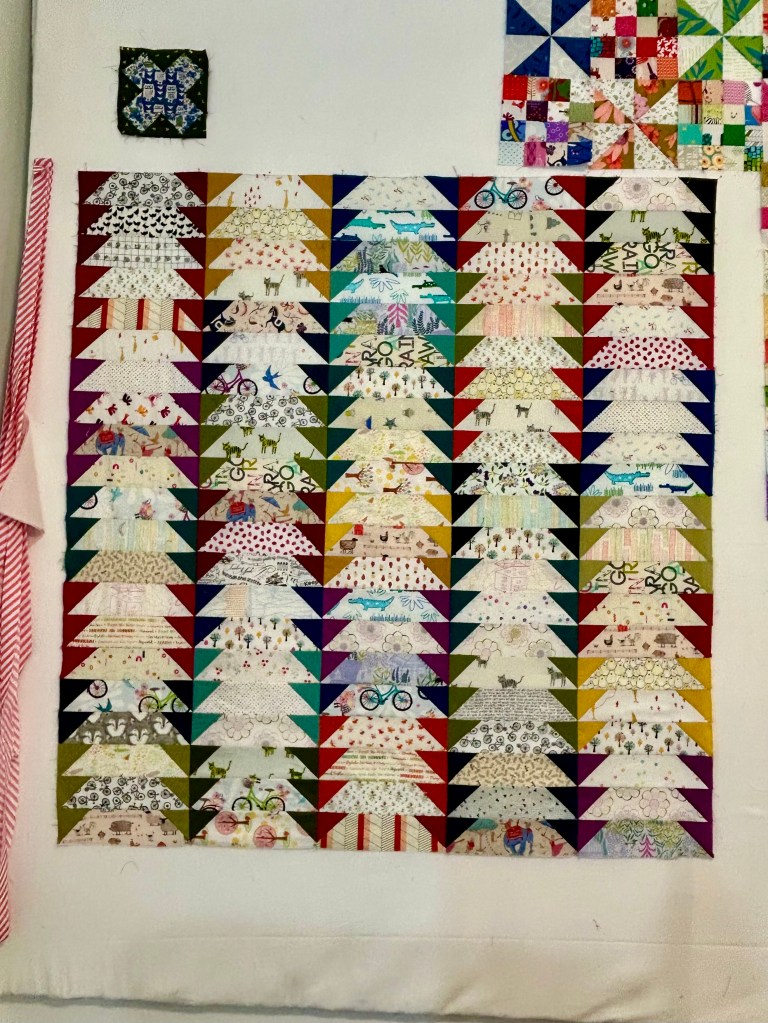 The improv quilt is growing too–but more slowly as I am having fun going through my ruler collection and playing with making blocks using the solid scraps. The circles on the top left and the “Lil’ Twister” strip at the bottom were fun to make. AND, I just found in my rulers a mini “Lil’ Twister” ruler that makes small twisters from 3.5-inch squares. Hmmmm…
